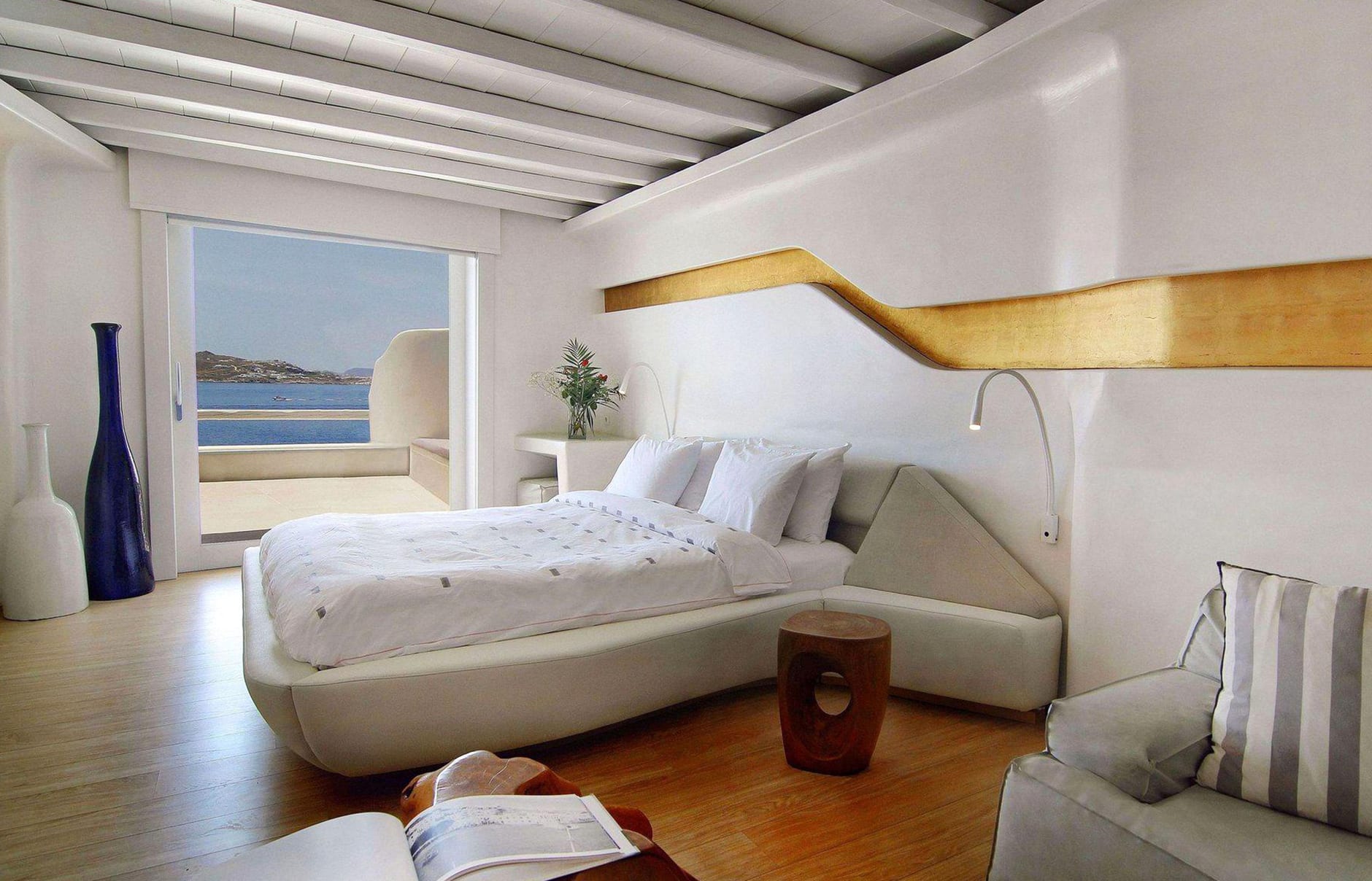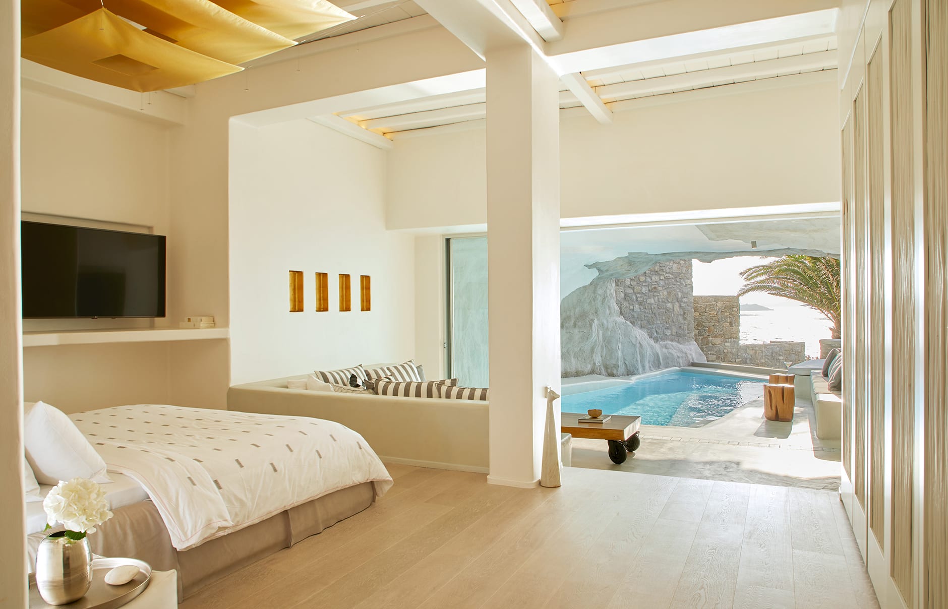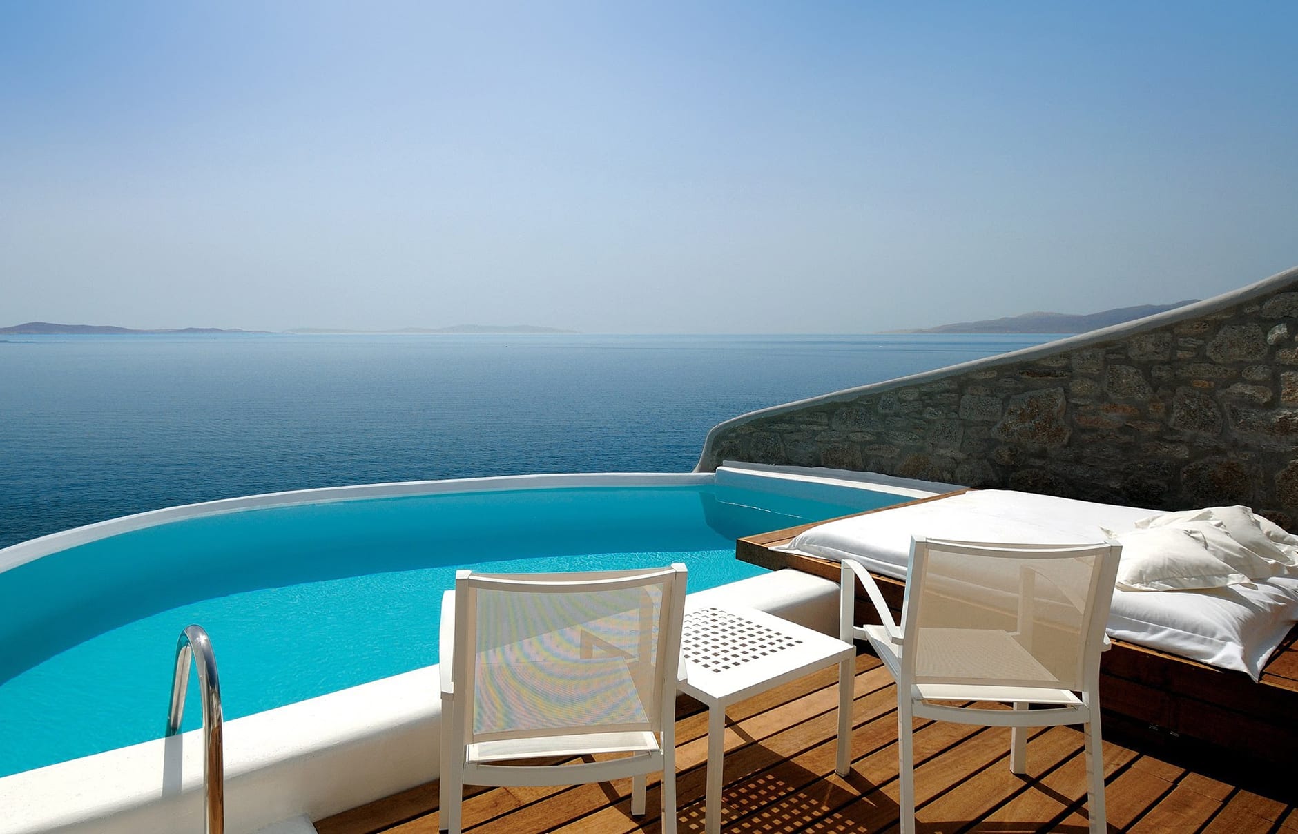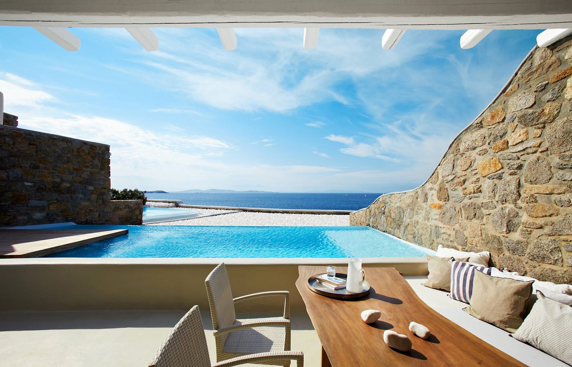Первоначально построенный на вершине заброшенного карьера в 1985 году владельцем-архитектором Пэрисом Лиакосом, а затем тщательно отремонтированный в 2007 году, этот “босоногий” комплекс установил высокую планку для всех современных отелей, которые последовали за ним на остров. 38-метровый пейзажный бассейн с морской водой, аквариумным баром и деревянным настилом, обращенным к закату, образует его сердце.