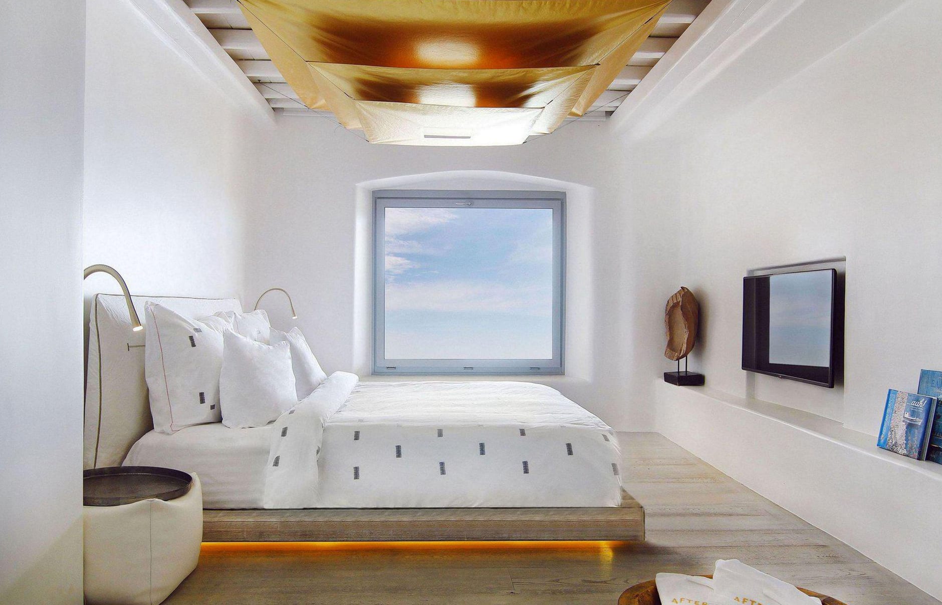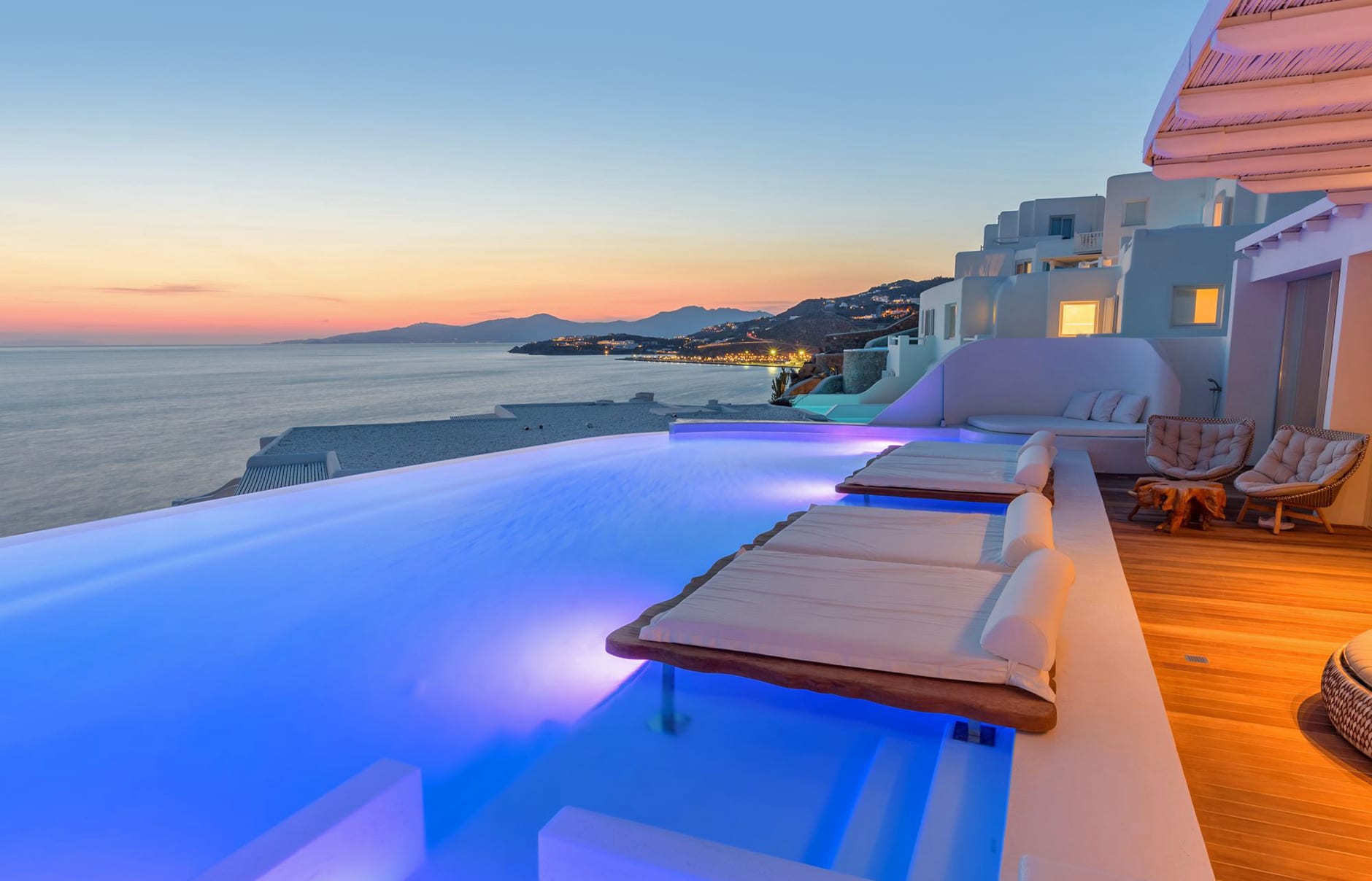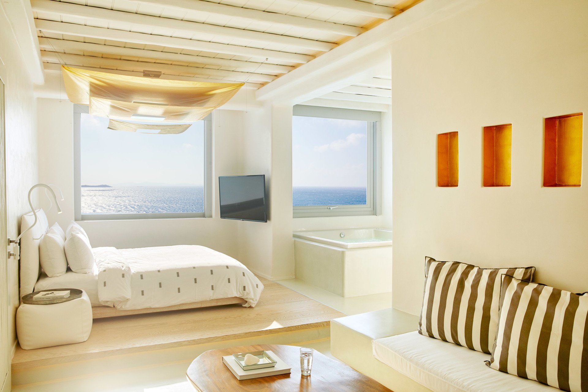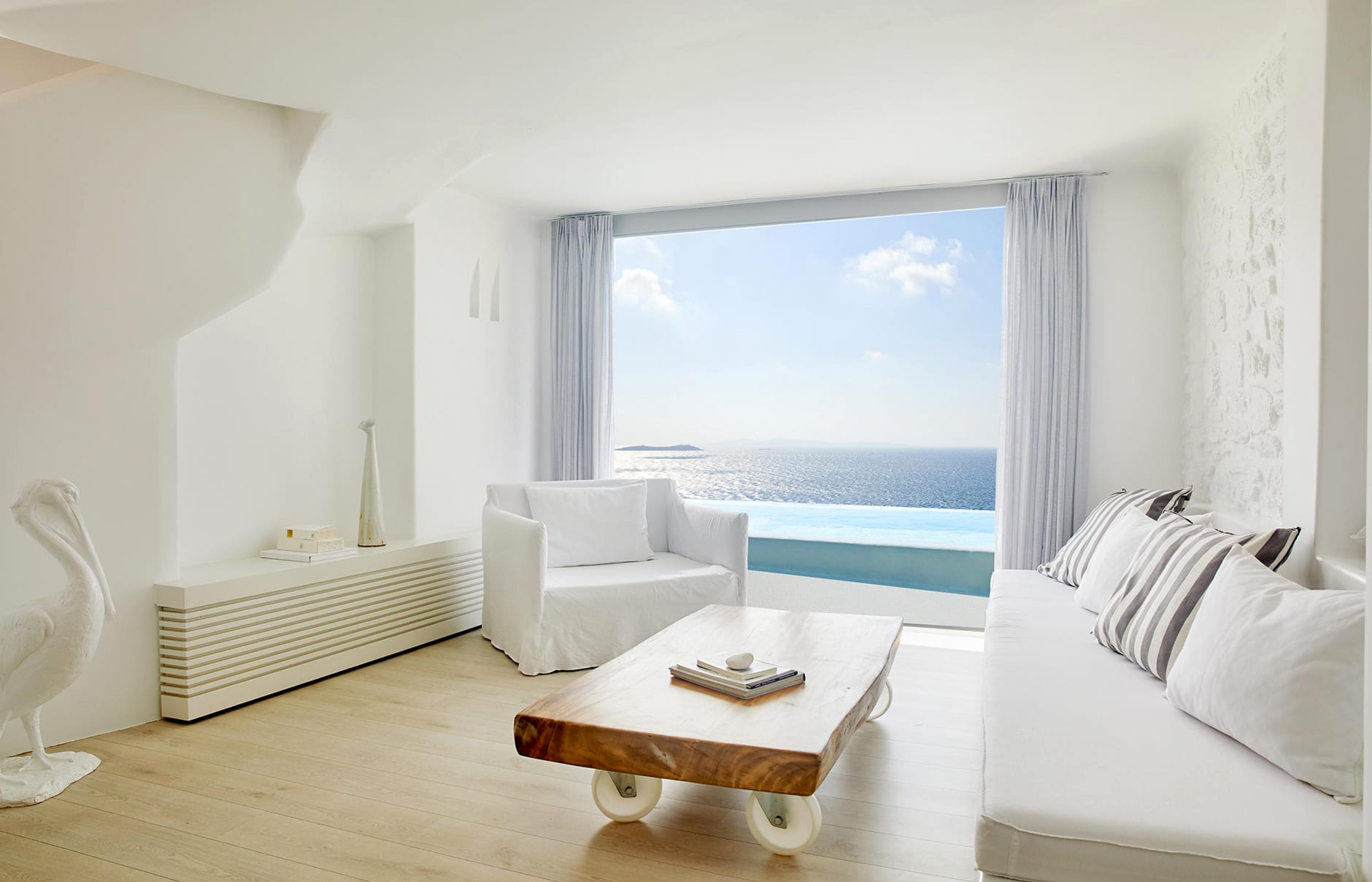 Первоначально построенный на вершине заброшенного карьера в 1985 году владельцем-архитектором Пэрисом Лиакосом, а затем тщательно отремонтированный в 2007 году, этот “босоногий” комплекс установил высокую планку для всех современных отелей, которые последовали за ним на остров. 38-метровый пейзажный бассейн с морской водой, аквариумным баром и деревянным настилом, обращенным к закату, образует его сердце.