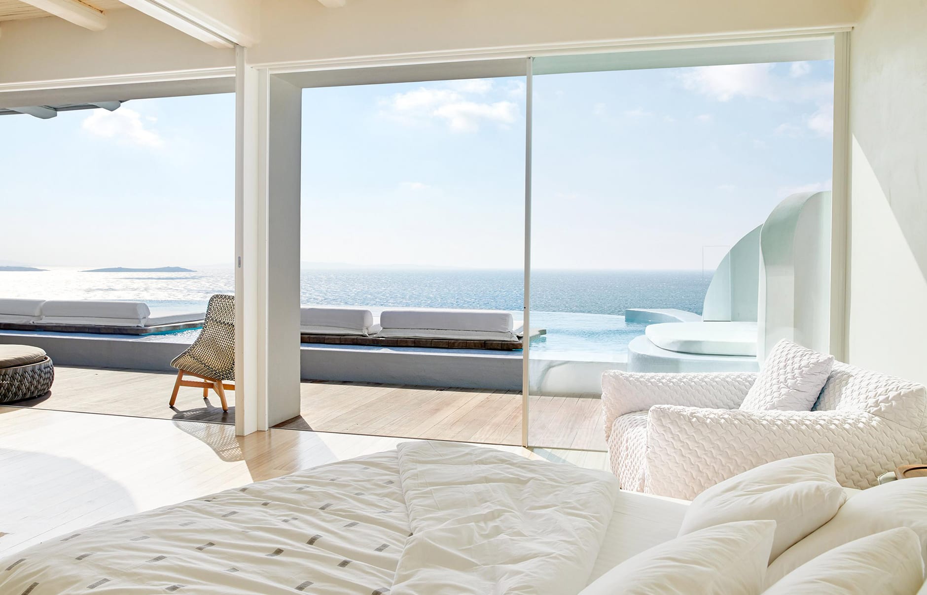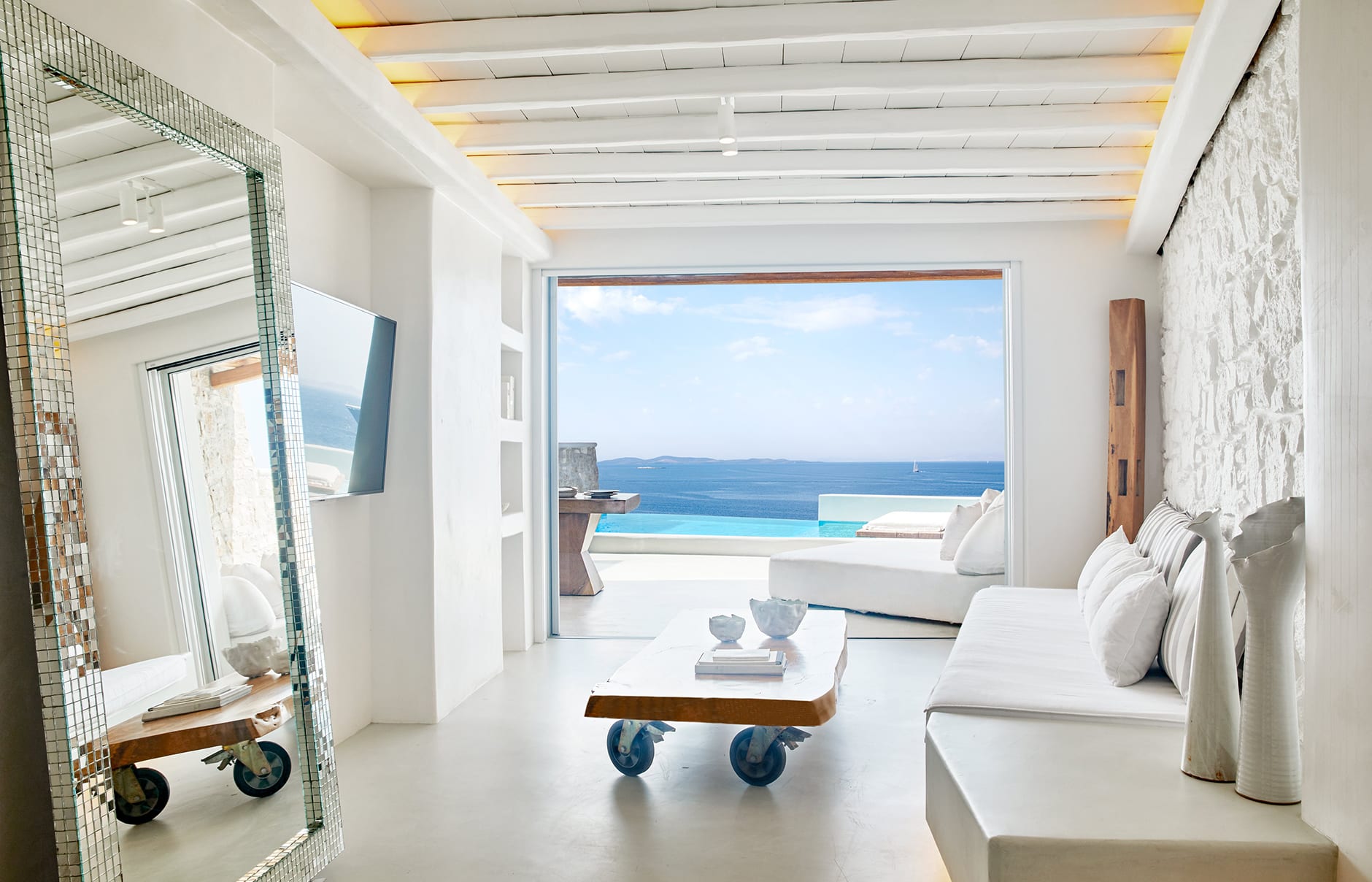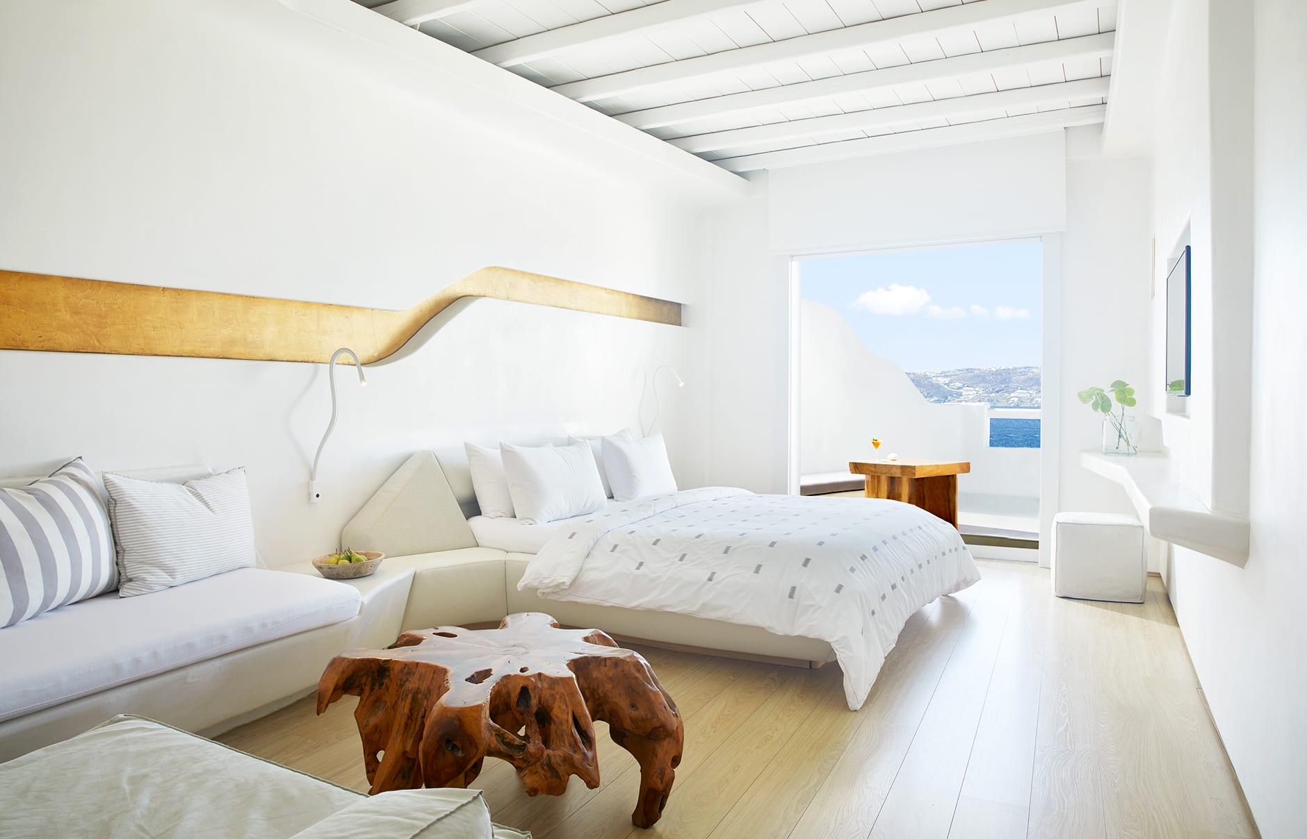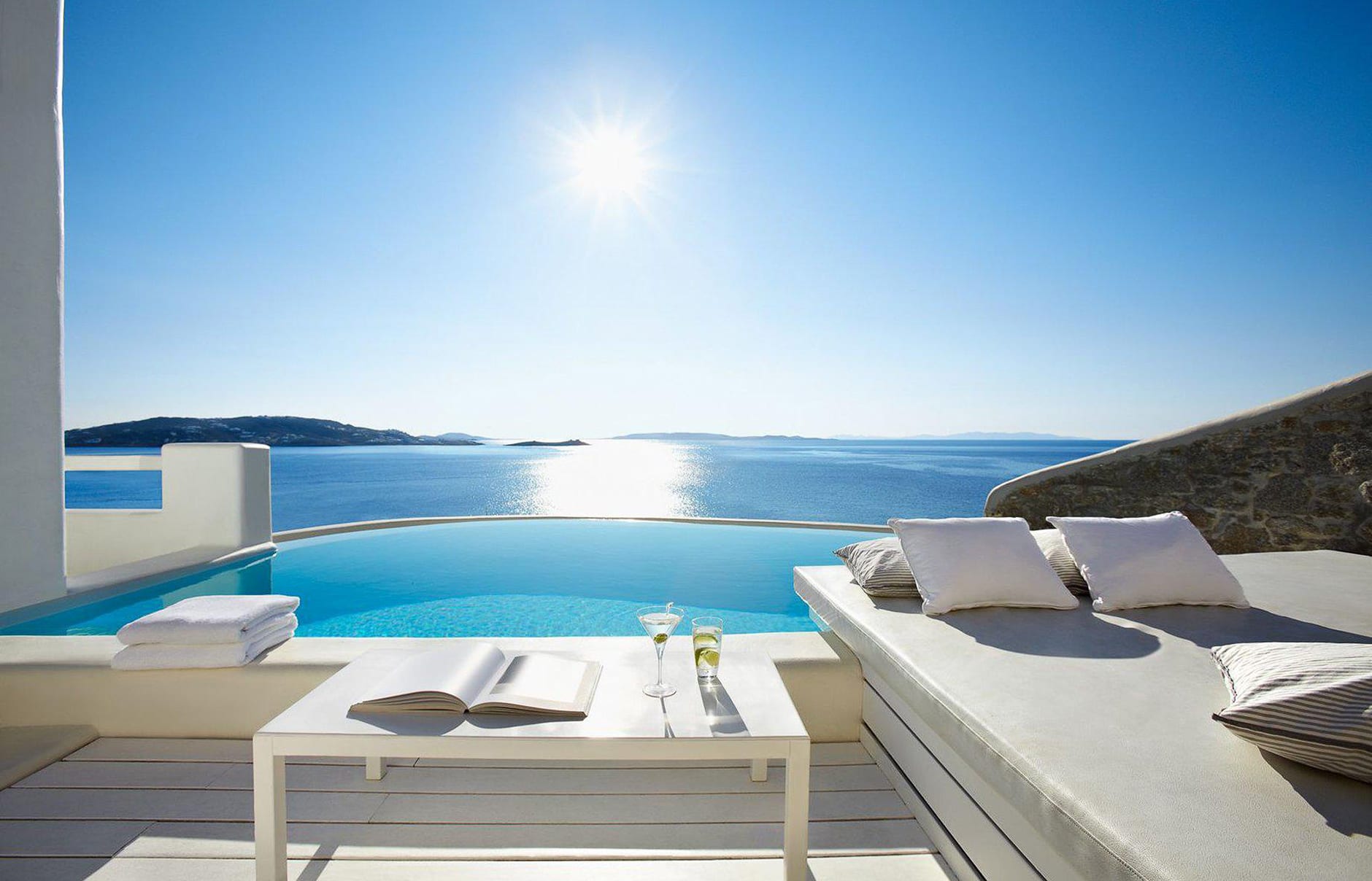 Первоначально построенный на вершине заброшенного карьера в 1985 году владельцем-архитектором Пэрисом Лиакосом, а затем тщательно отремонтированный в 2007 году, этот “босоногий” комплекс установил высокую планку для всех современных отелей, которые последовали за ним на остров. 38-метровый пейзажный бассейн с морской водой, аквариумным баром и деревянным настилом, обращенным к закату, образует его сердце.