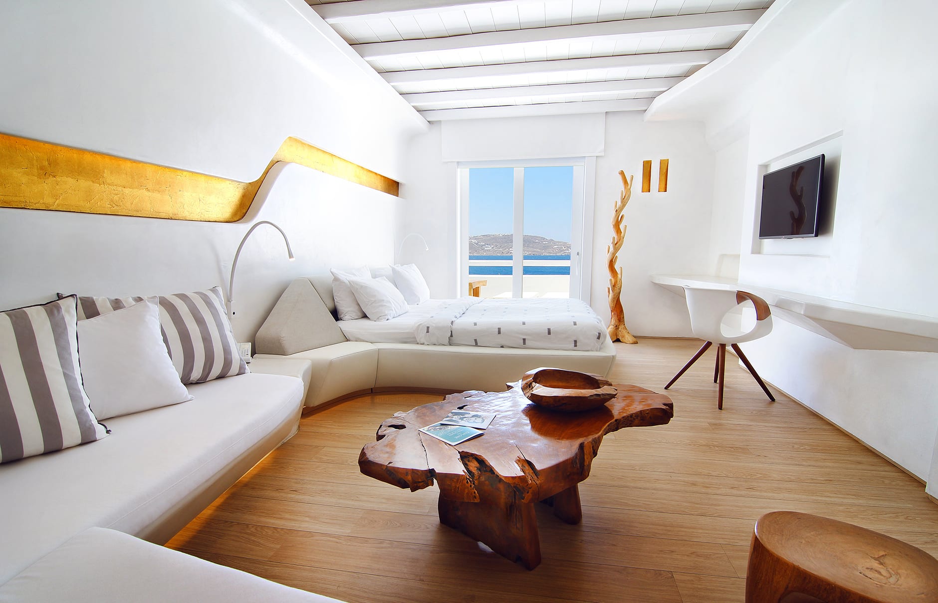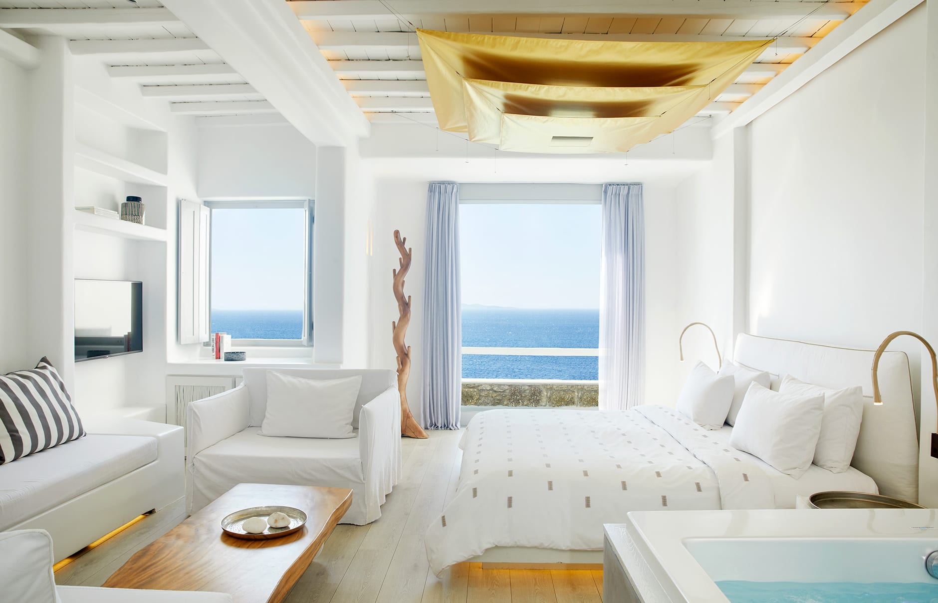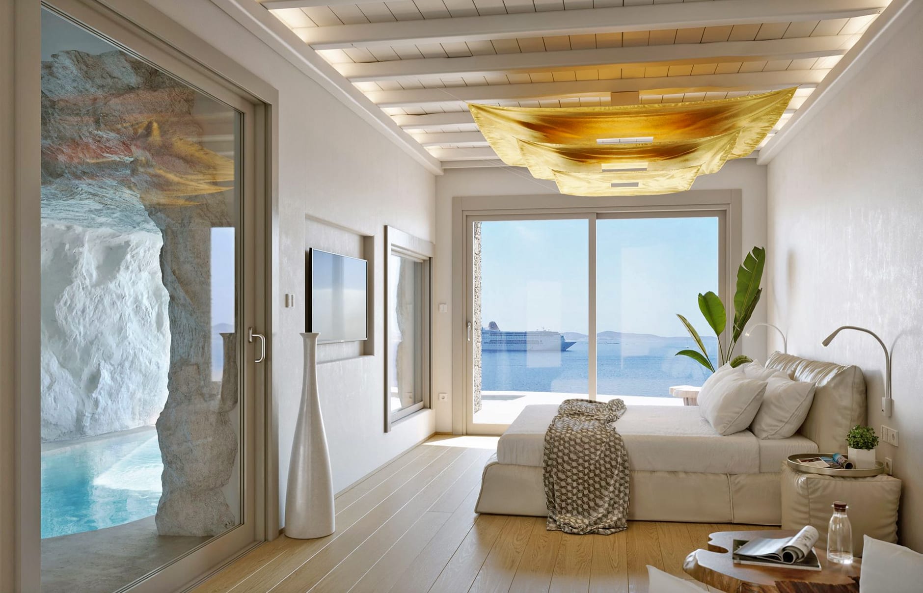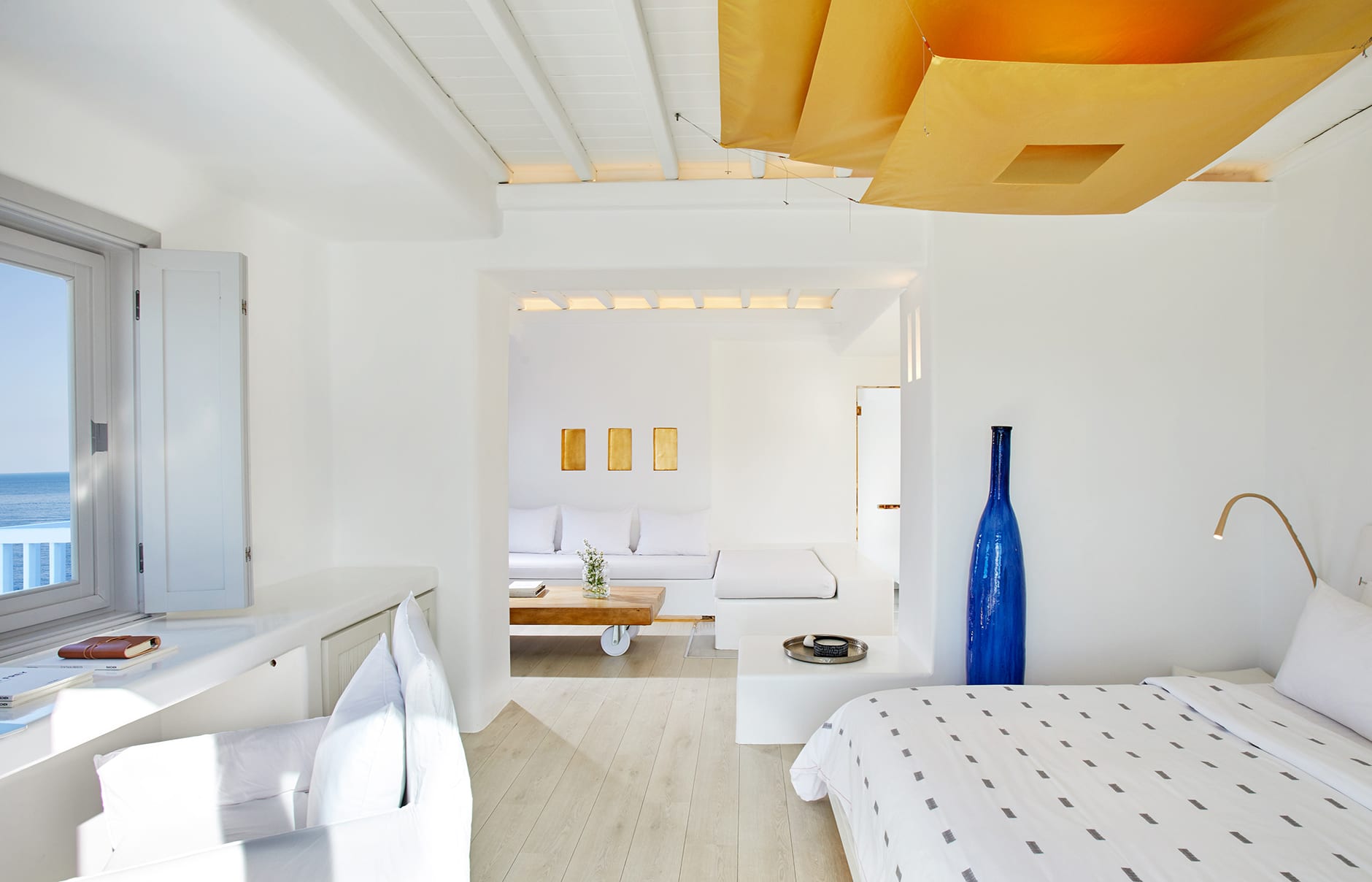 Первоначально построенный на вершине заброшенного карьера в 1985 году владельцем-архитектором Пэрисом Лиакосом, а затем тщательно отремонтированный в 2007 году, этот “босоногий” комплекс установил высокую планку для всех современных отелей, которые последовали за ним на остров. 38-метровый пейзажный бассейн с морской водой, аквариумным баром и деревянным настилом, обращенным к закату, образует его сердце.