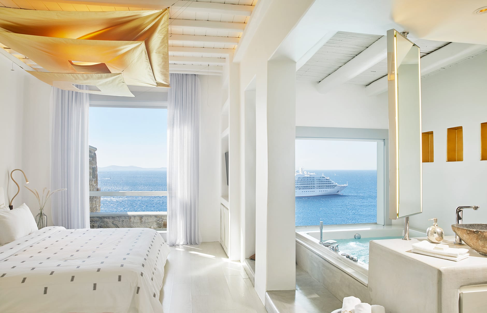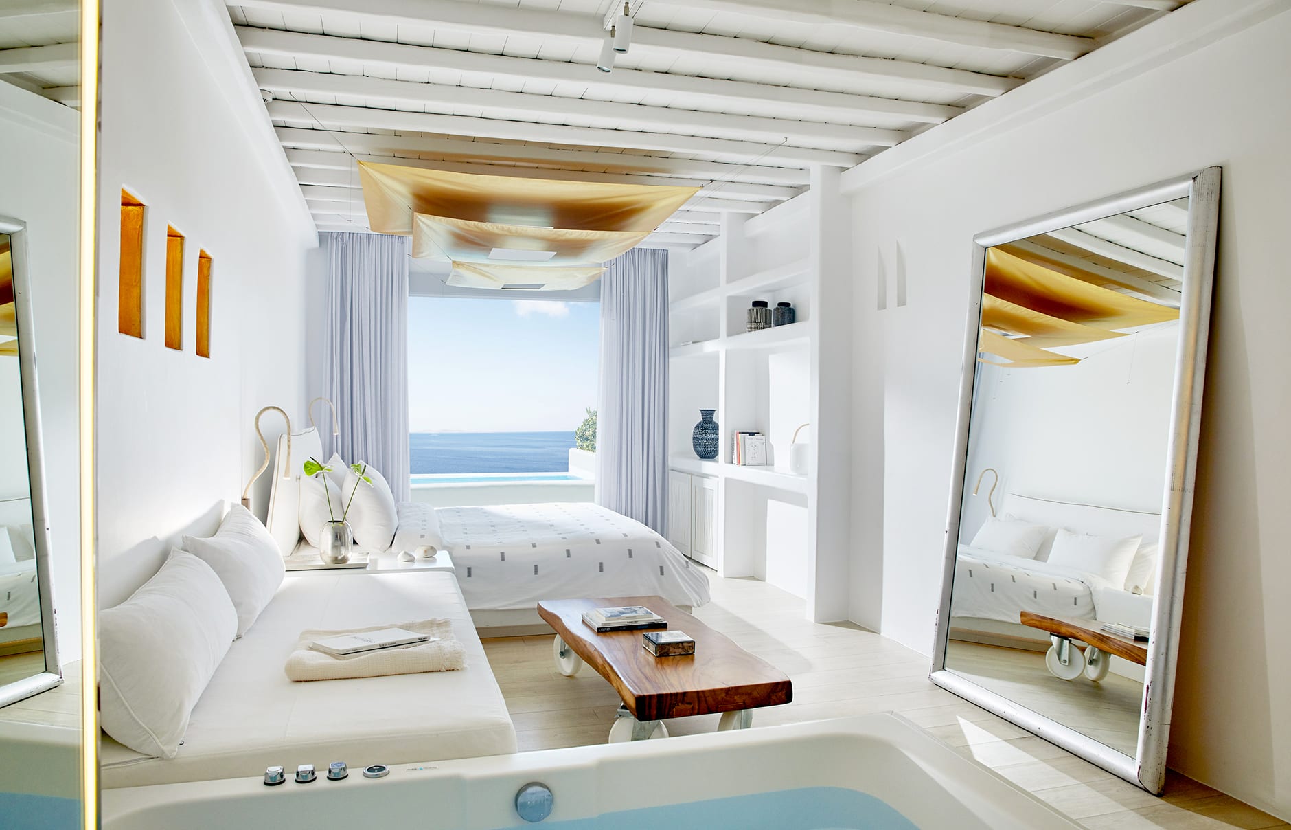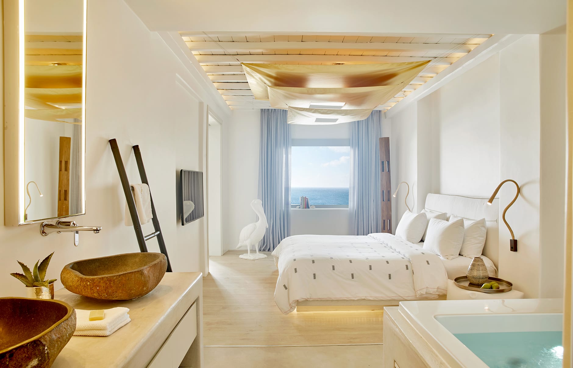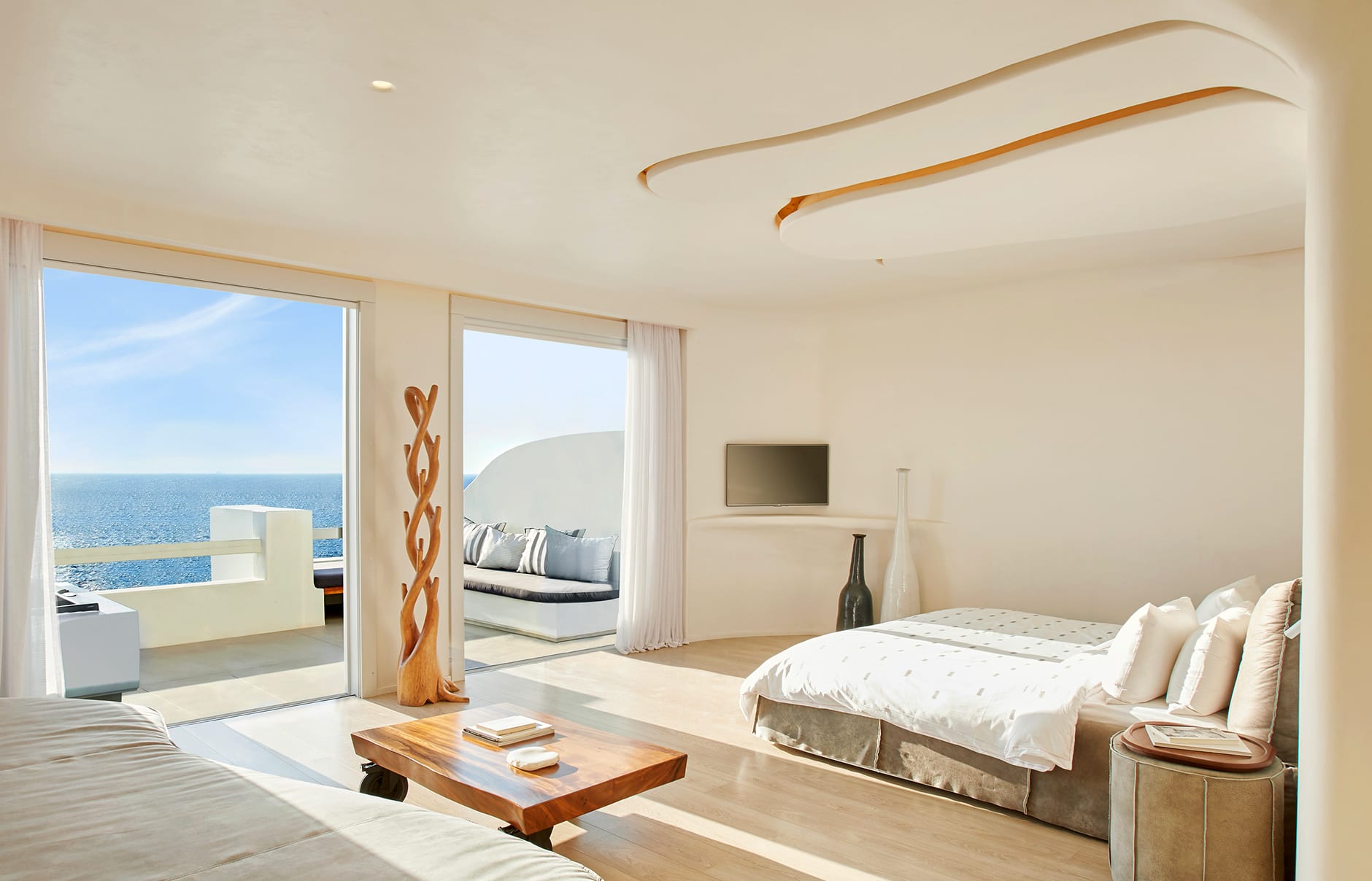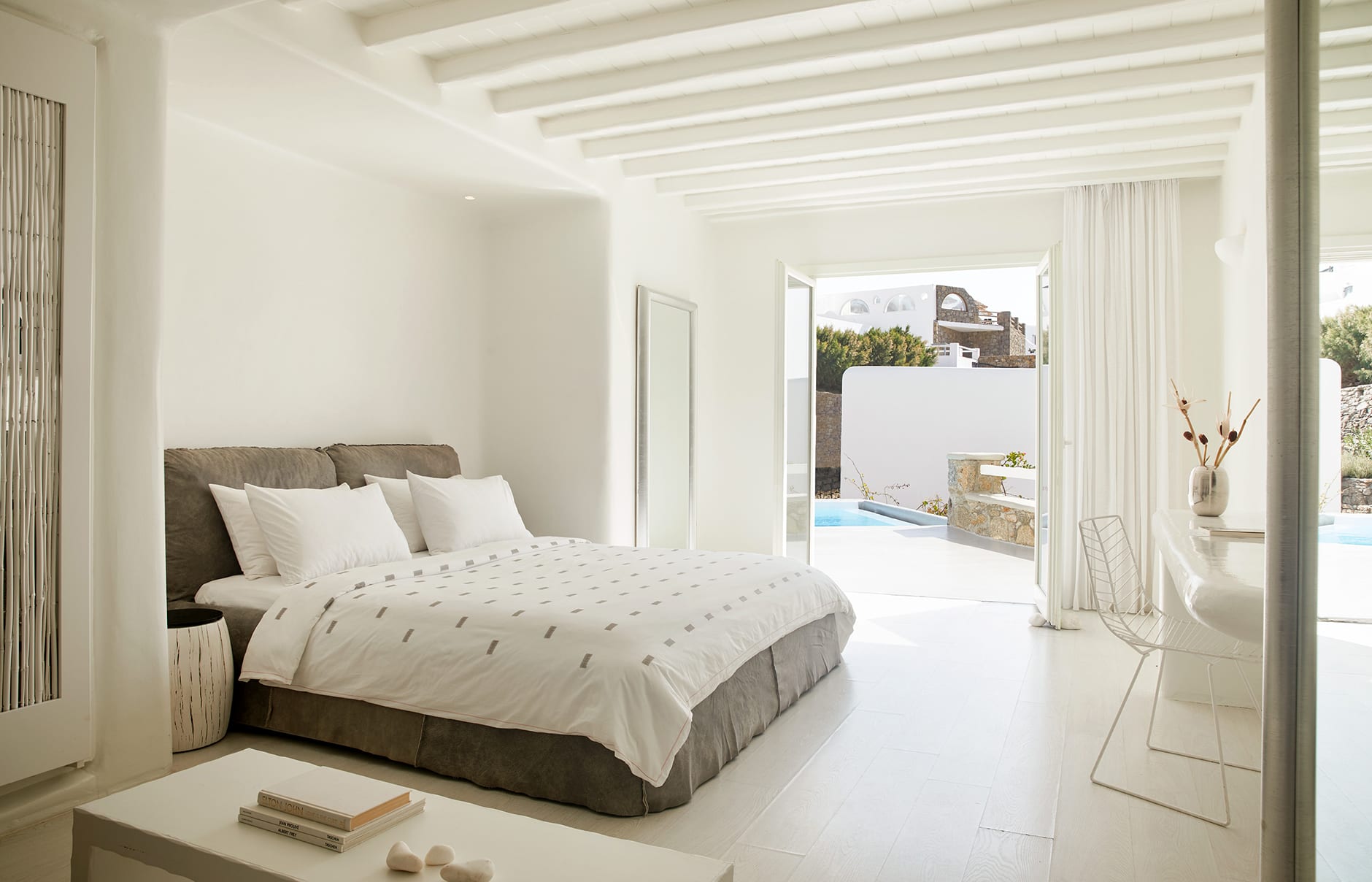 Номера, люксы или виллы с минималистичным декором и мебелью выдержаны в приглушенных тонах. Ванные комнаты отделаны мрамором и оснащены гидромассажными ваннами и премиальными принадлежностями Korres.