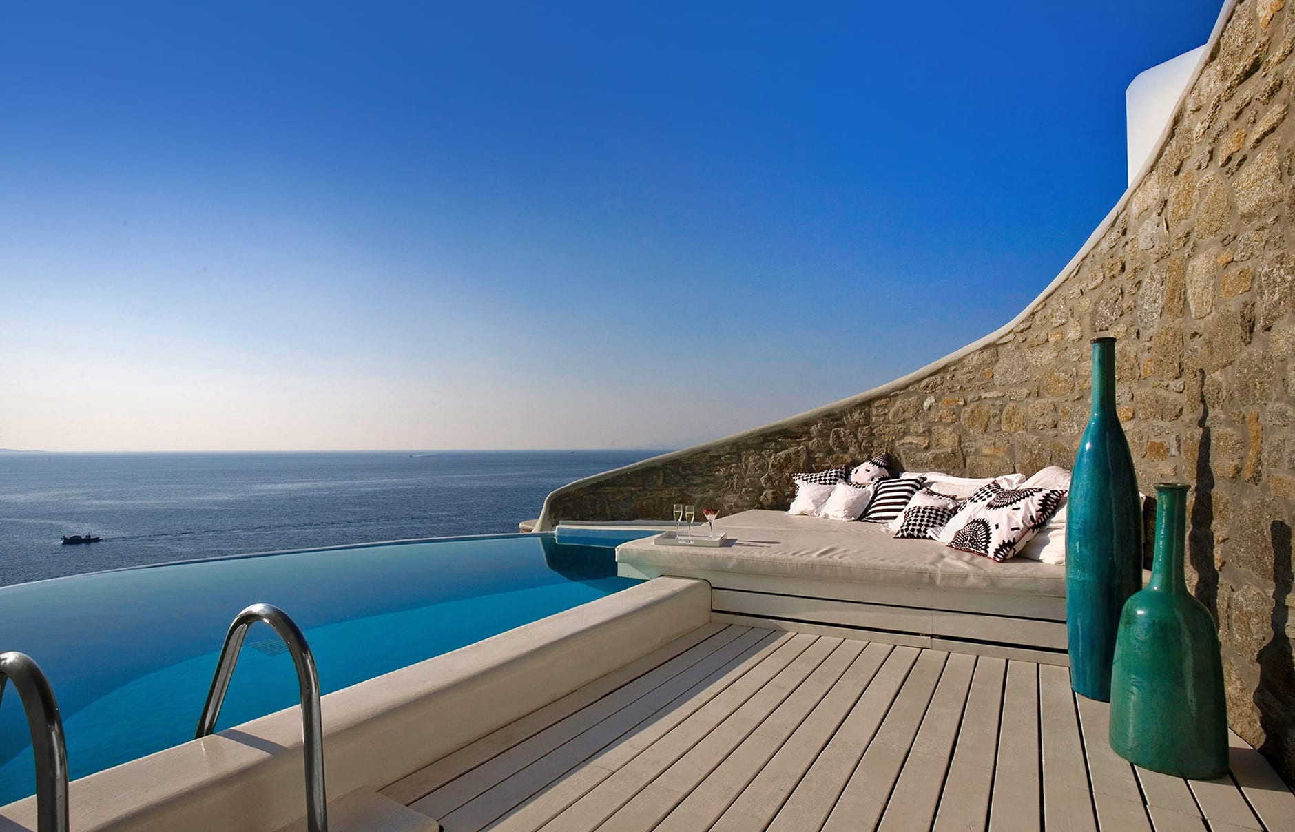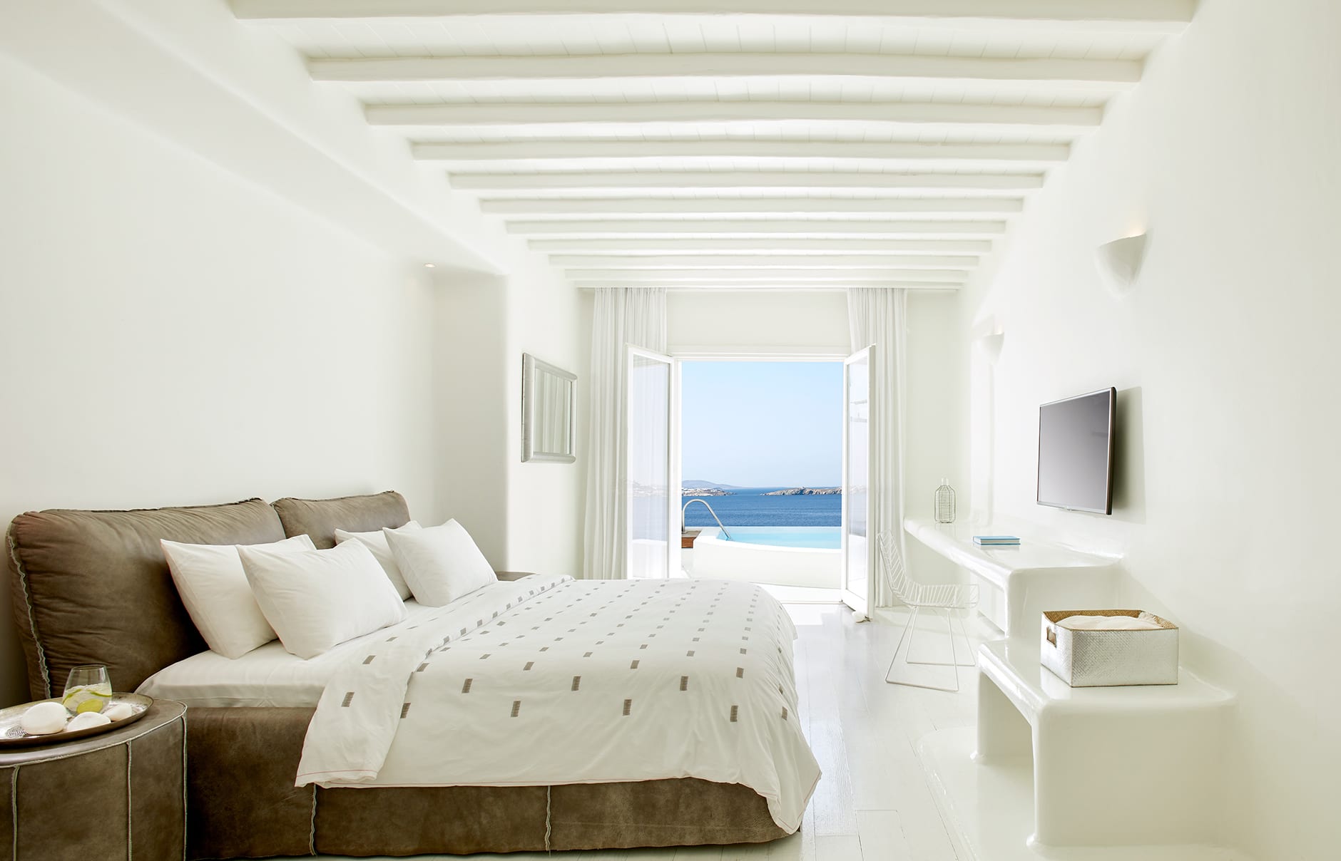 Один из первых построенных на острове и до сих пор один из лучших роскошных комплексов, Cavo Tagoo смотрит на море со своего склона холма недалеко от Хоры, Миконос. Это стильный отель, предлагающий просторные номера с частными небольшими бассейнами и щедрые завтраки.