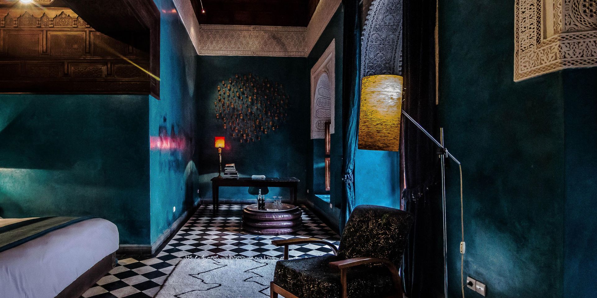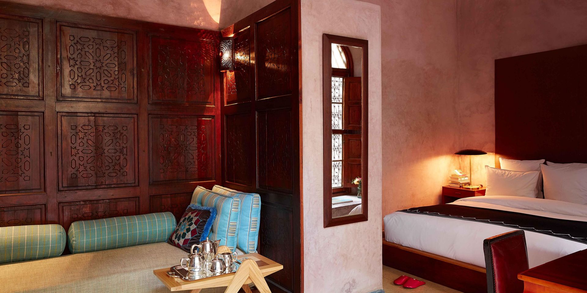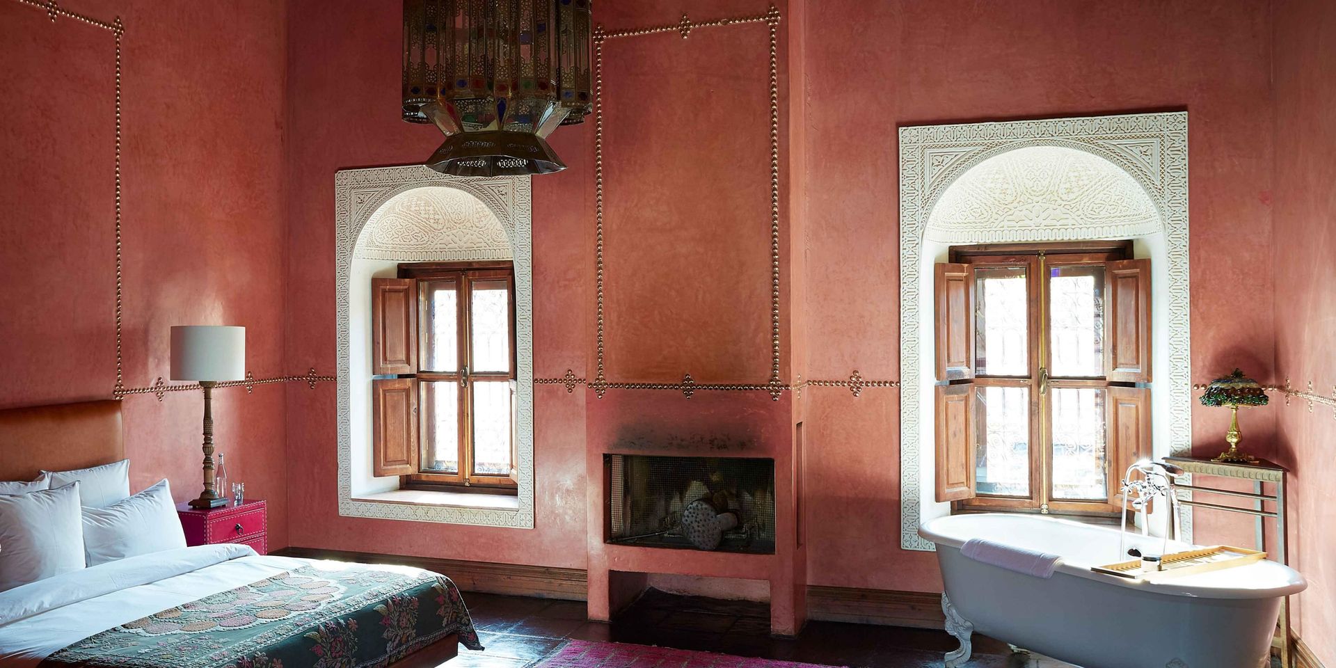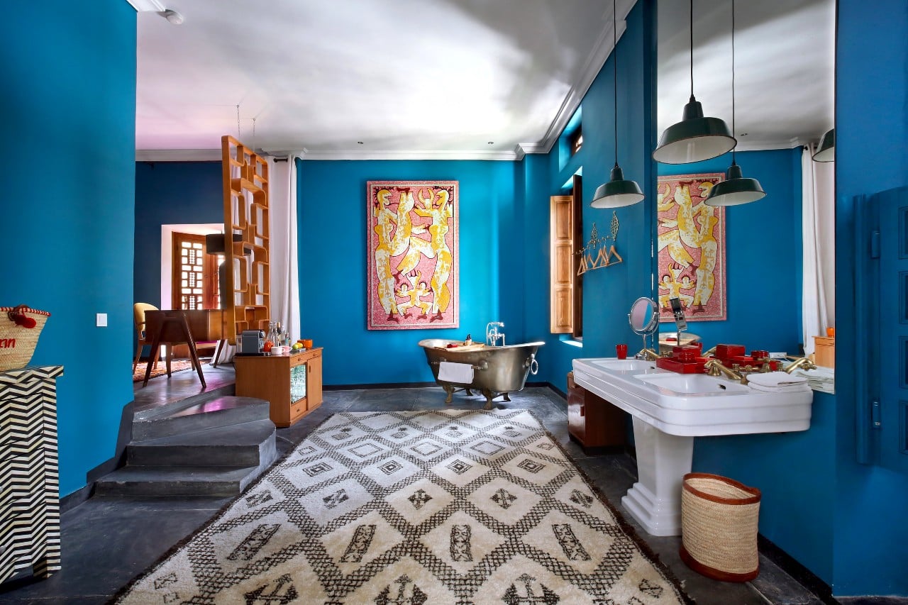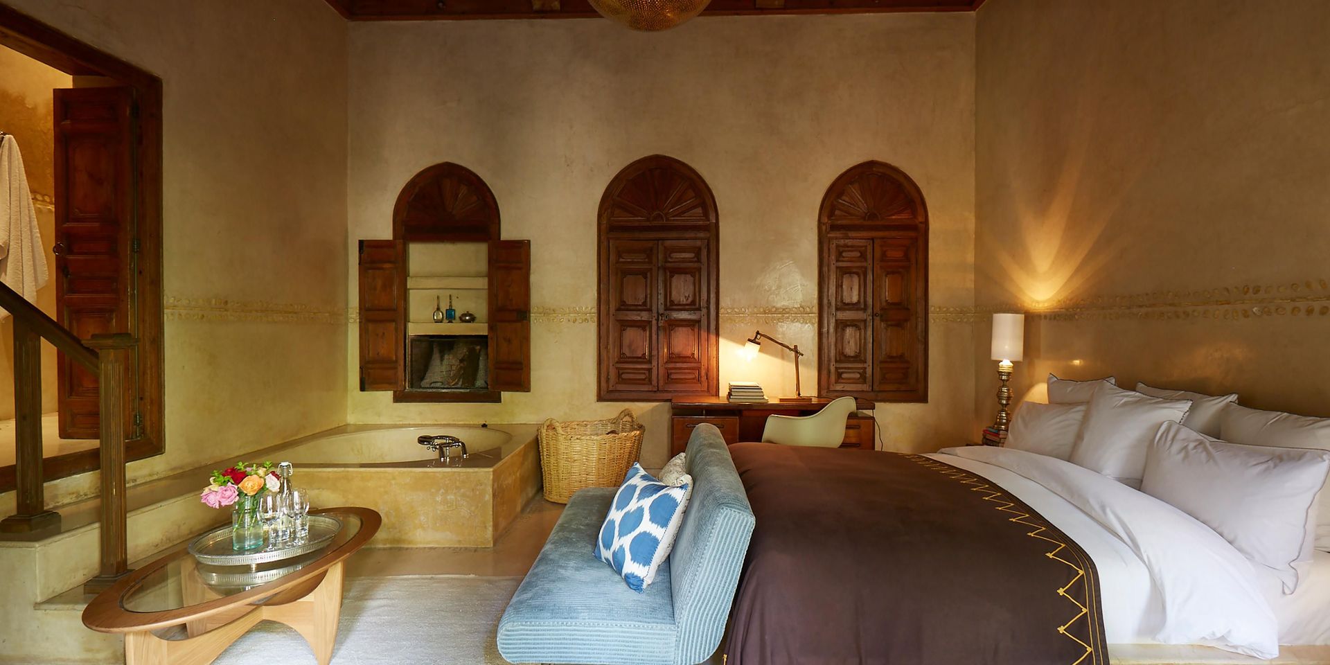 Здесь нет двух одинаковых комнат. Некоторые ярко-розовые, другие бирюзовые. В некоторых номерах полы из верблюжьей кожи ручной работы, а стены отделаны известковой штукатуркой. Но все они разделяют фирменный стиль: сочетание европейской мебели середины века с культовыми элементами марокканского дизайна, включая лепнину и потолки из кедрового дерева.