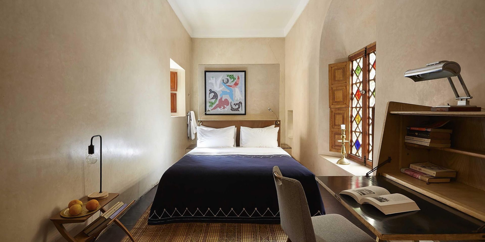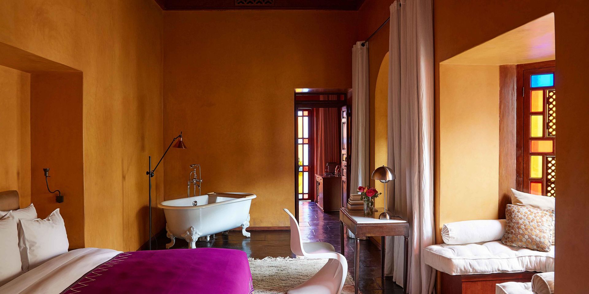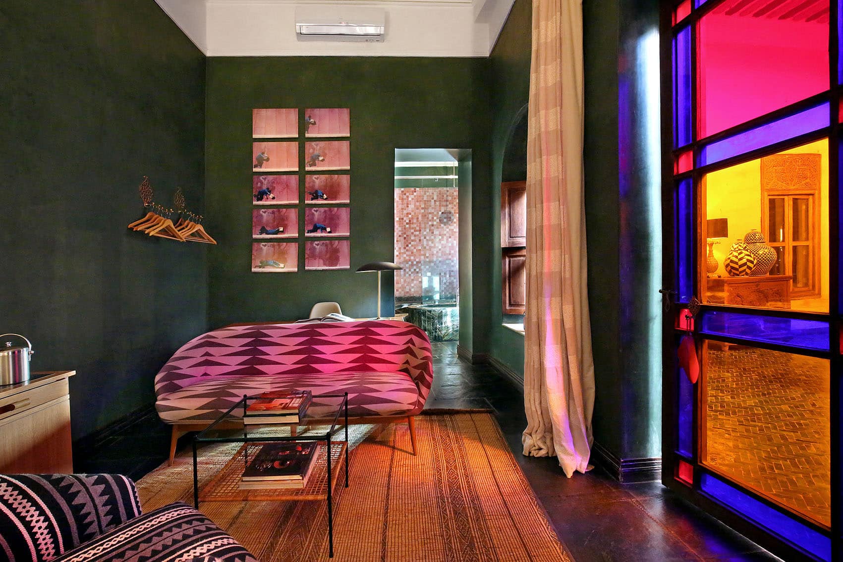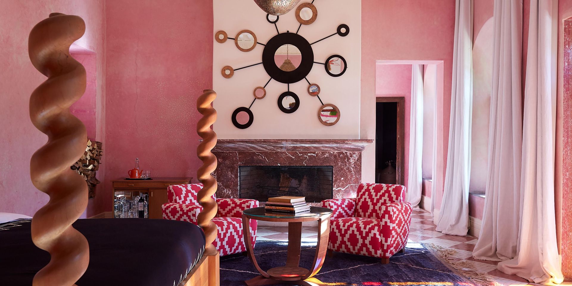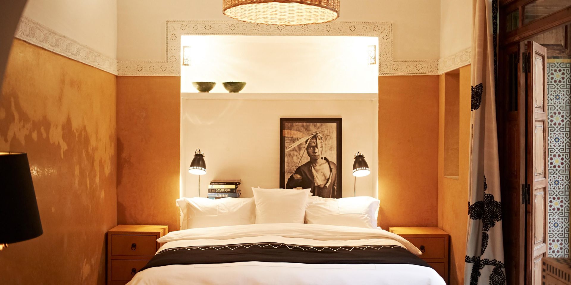 Здесь нет двух одинаковых комнат. Некоторые ярко-розовые, другие бирюзовые. В некоторых номерах полы из верблюжьей кожи ручной работы, а стены отделаны известковой штукатуркой. Но все они разделяют фирменный стиль: сочетание европейской мебели середины века с культовыми элементами марокканского дизайна, включая лепнину и потолки из кедрового дерева.