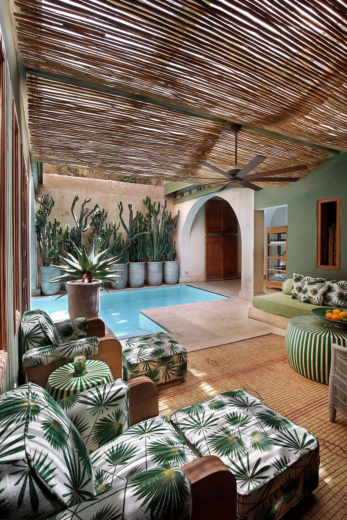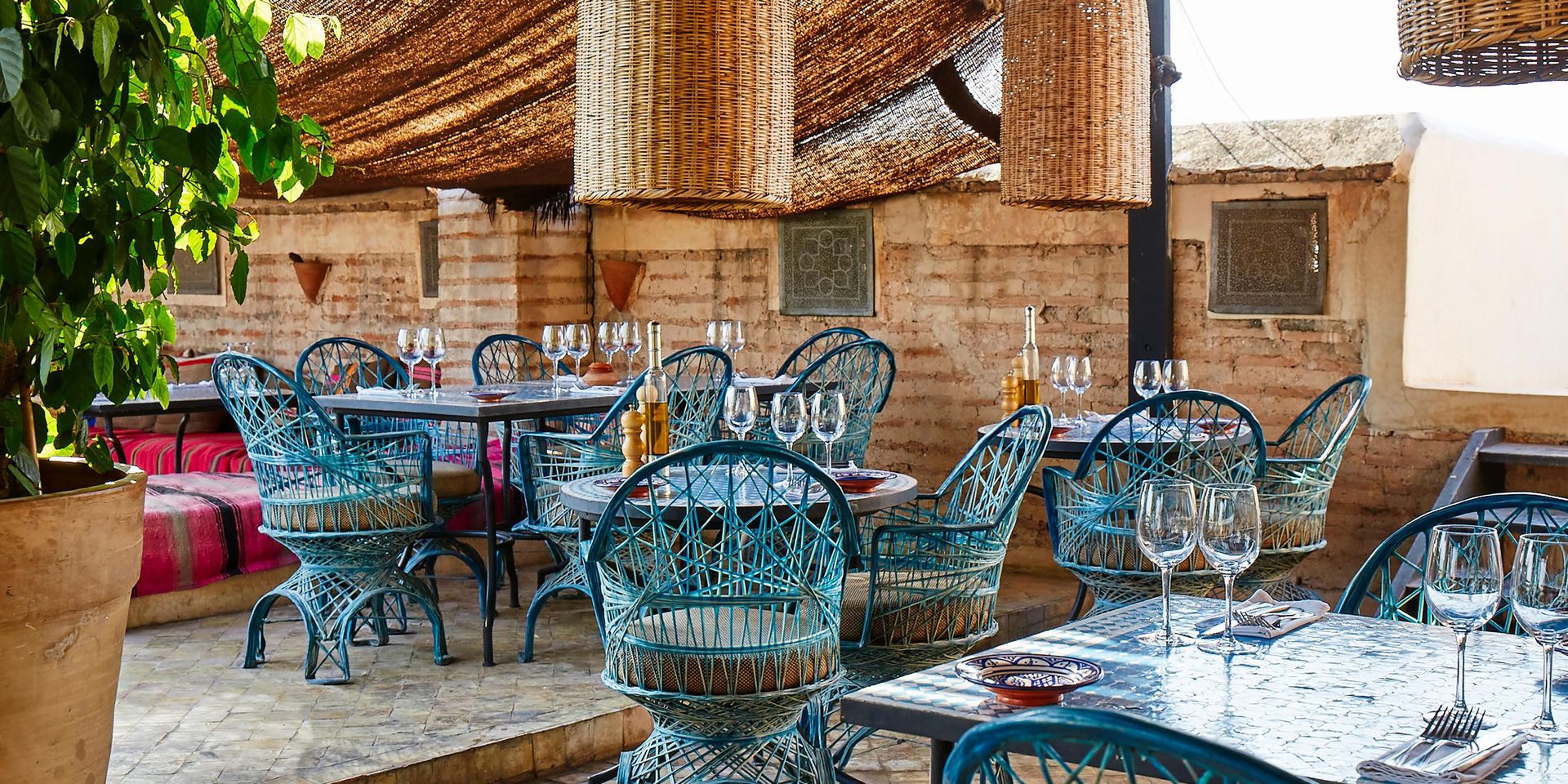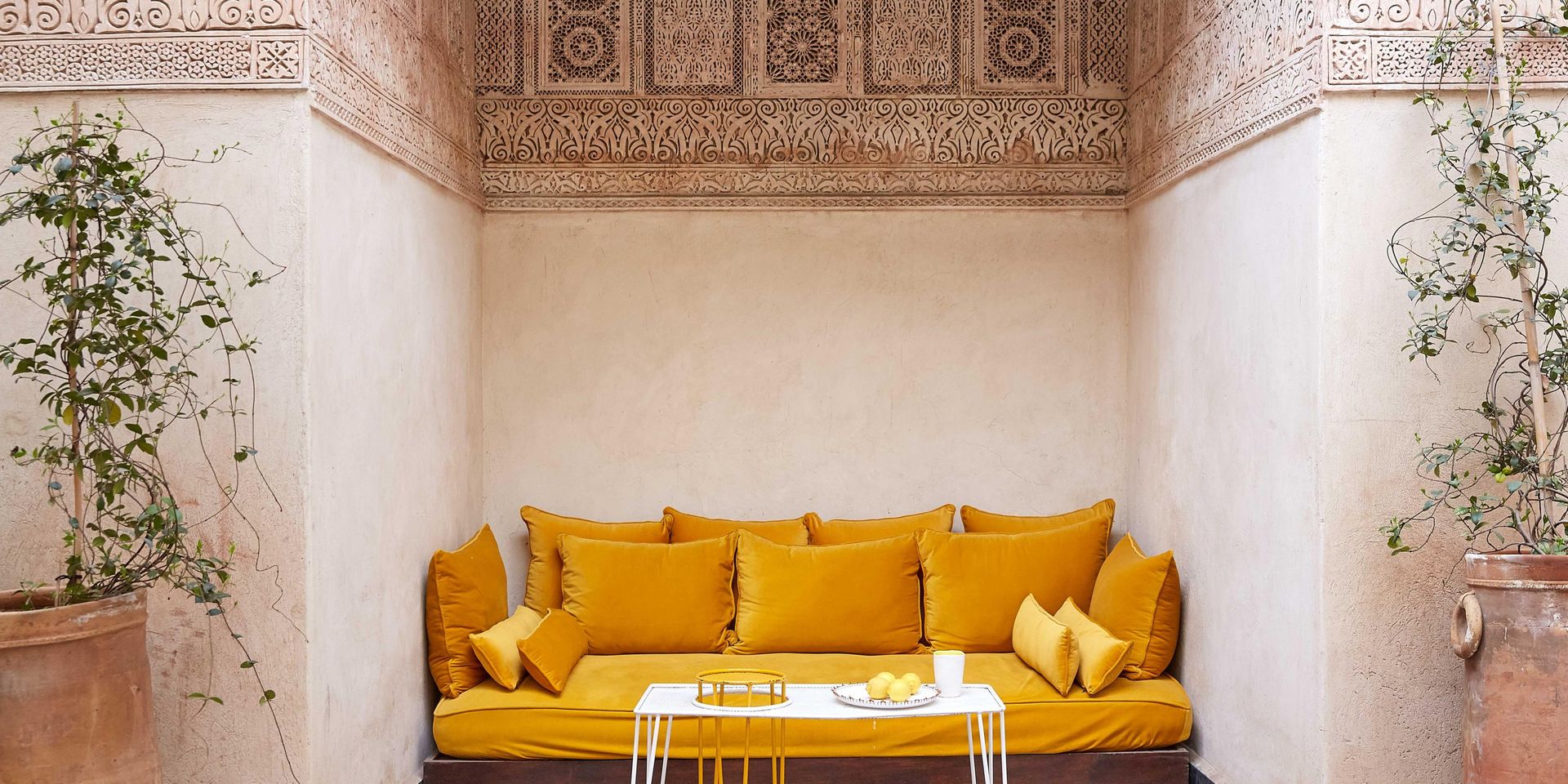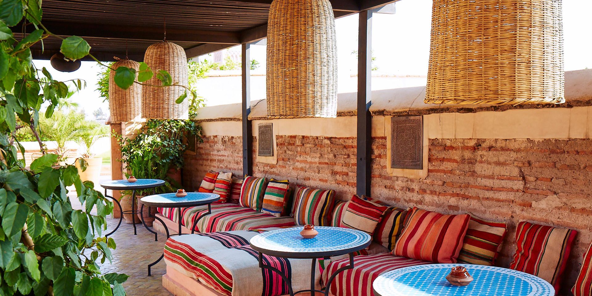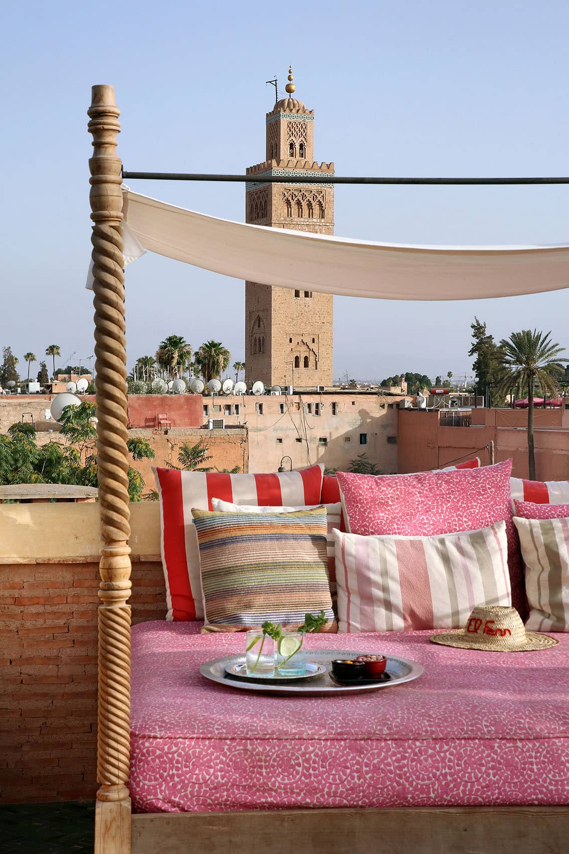 Здесь нет двух одинаковых комнат. Некоторые ярко-розовые, другие бирюзовые. В некоторых номерах полы из верблюжьей кожи ручной работы, а стены отделаны известковой штукатуркой. Но все они разделяют фирменный стиль: сочетание европейской мебели середины века с культовыми элементами марокканского дизайна, включая лепнину и потолки из кедрового дерева.