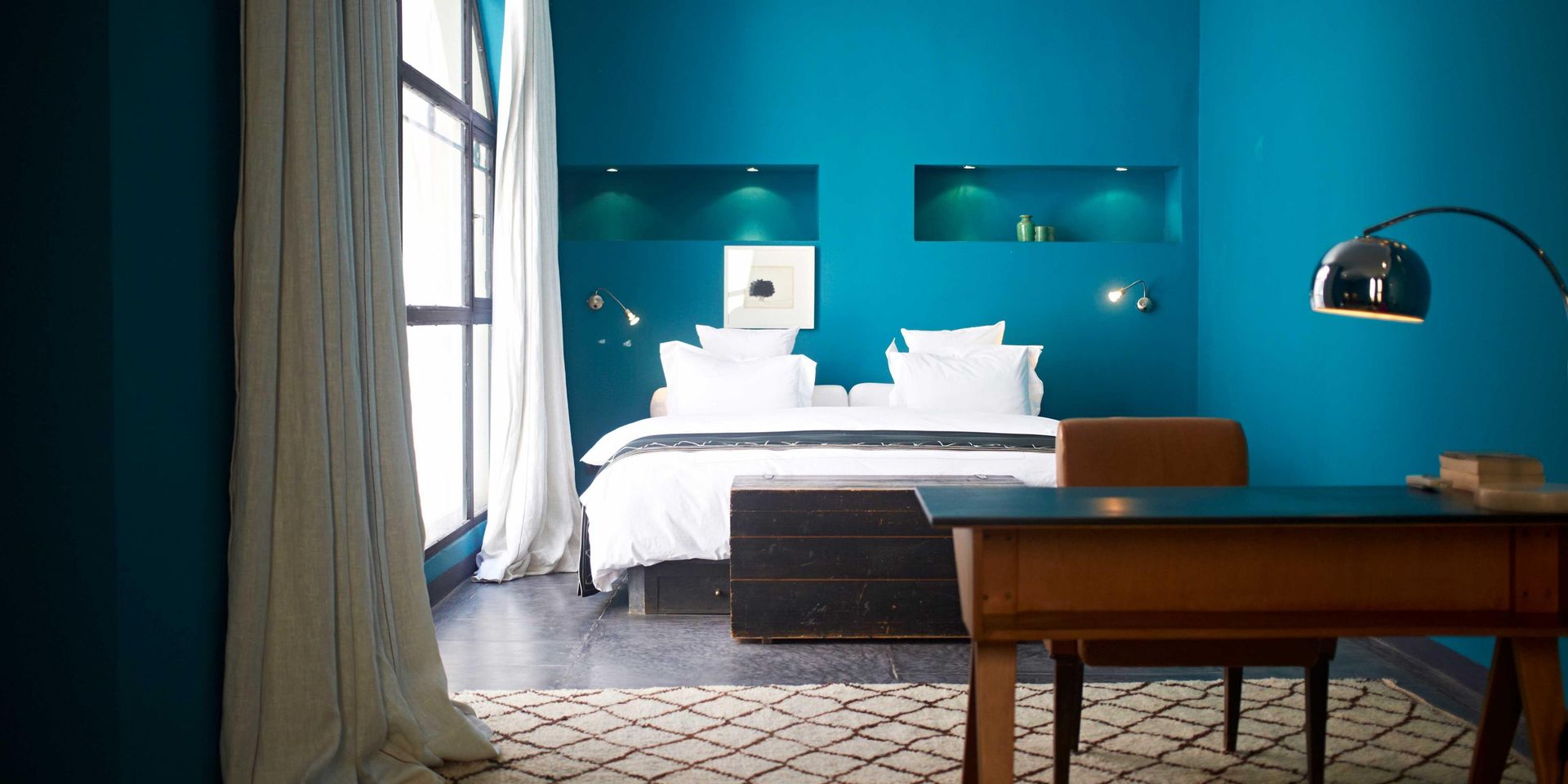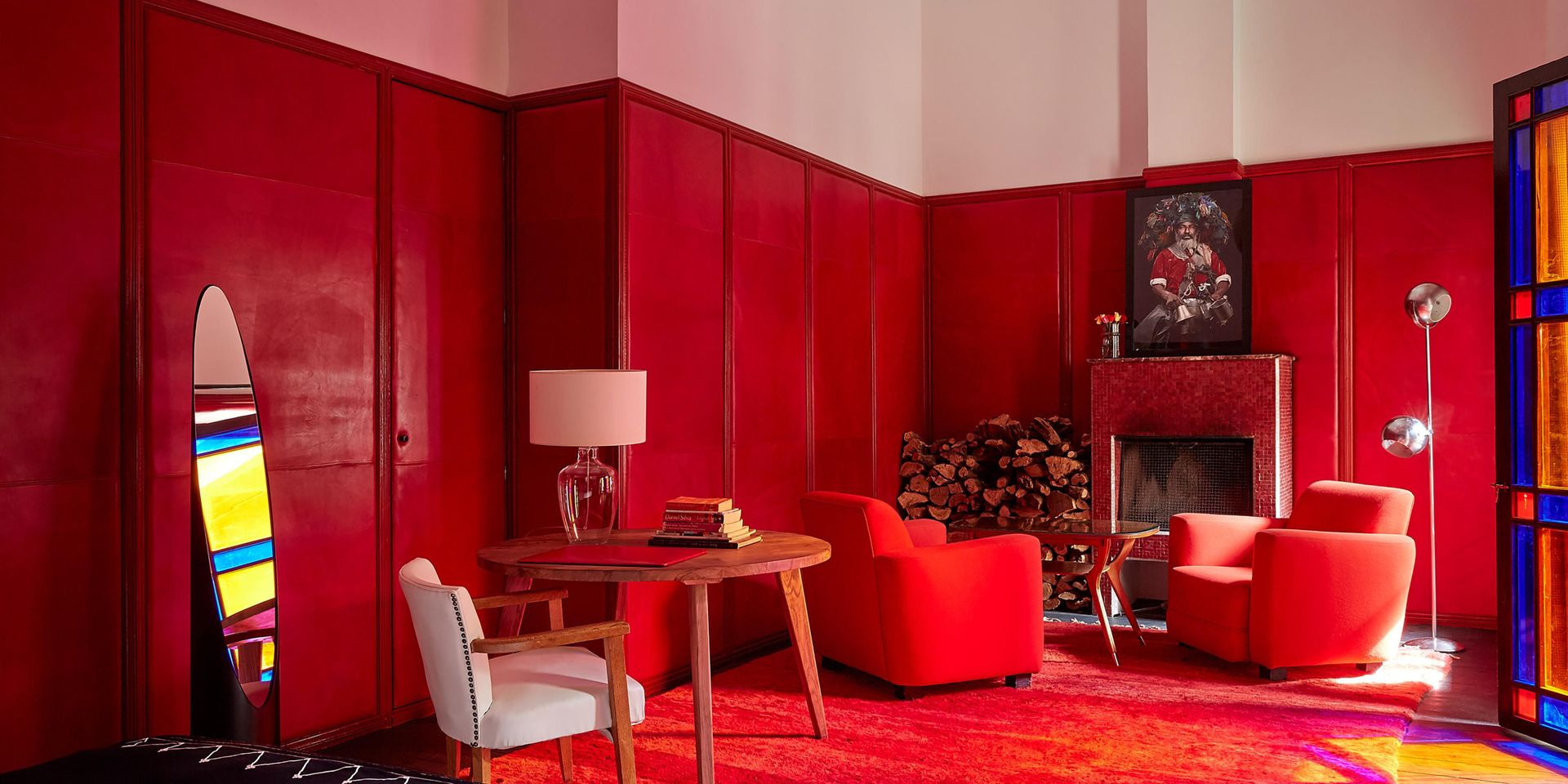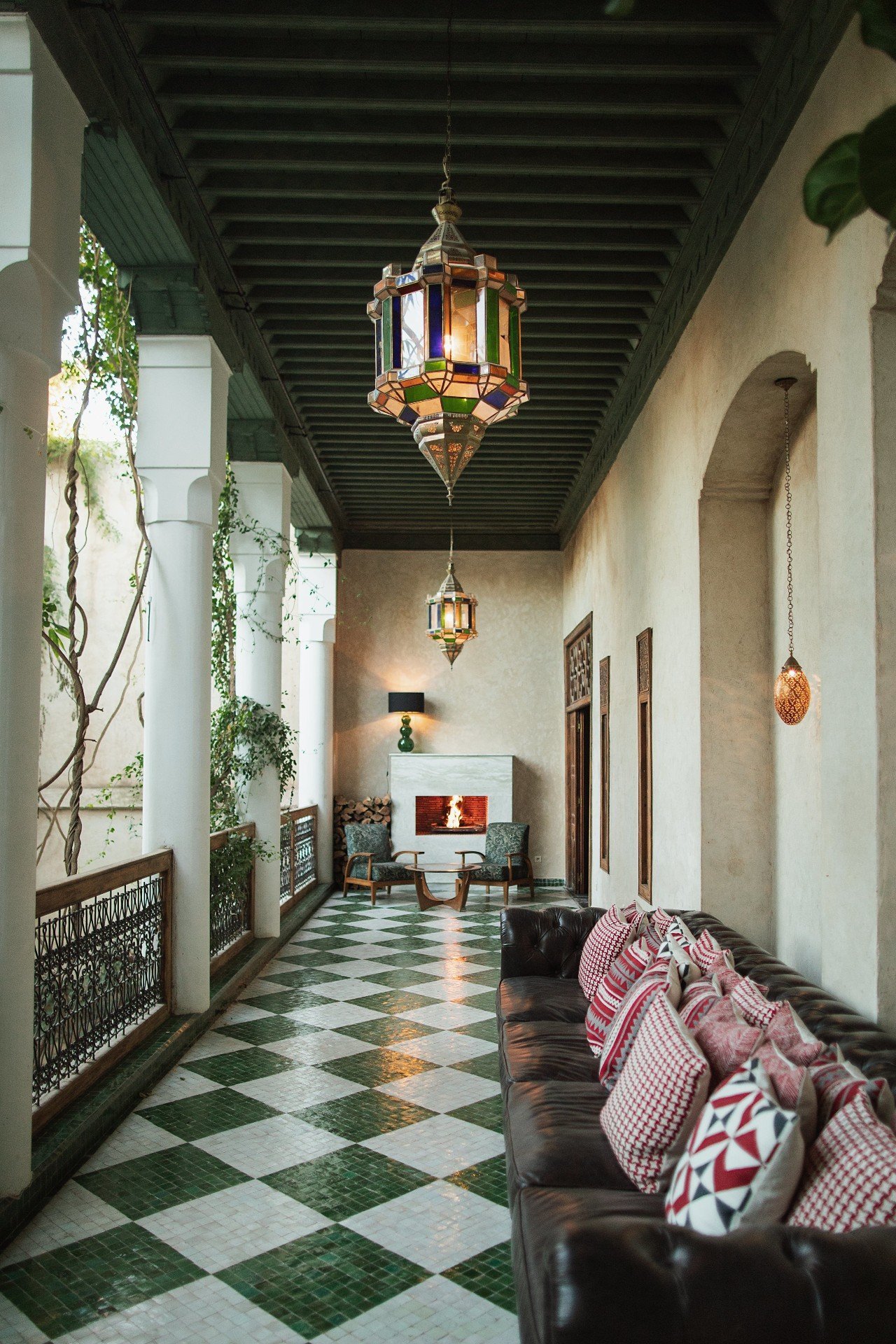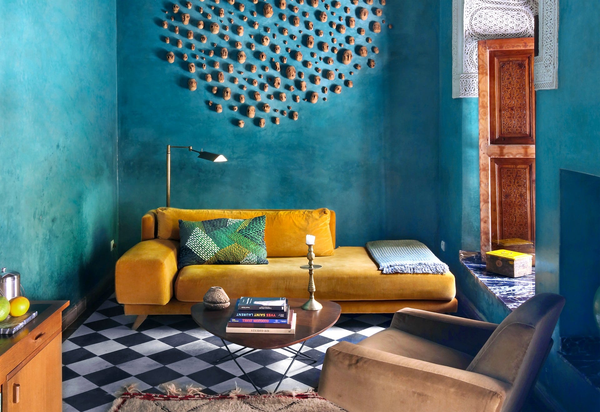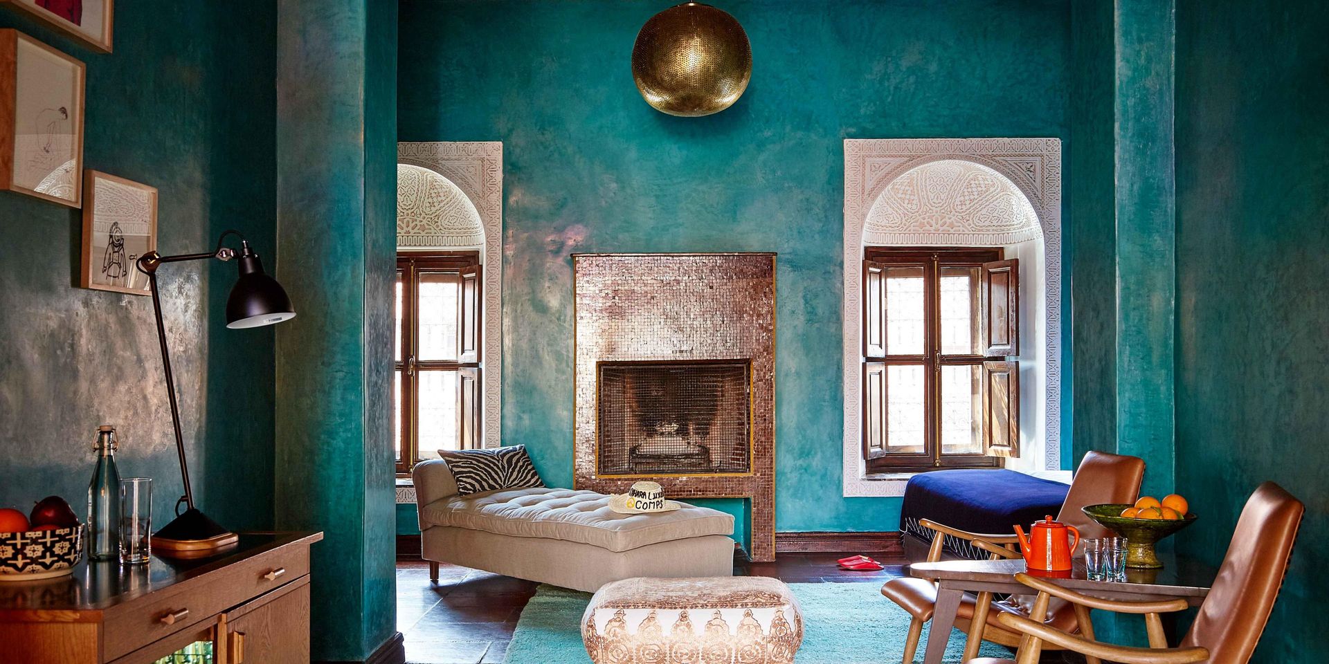 Здесь нет двух одинаковых комнат. Некоторые ярко-розовые, другие бирюзовые. В некоторых номерах полы из верблюжьей кожи ручной работы, а стены отделаны известковой штукатуркой. Но все они разделяют фирменный стиль: сочетание европейской мебели середины века с культовыми элементами марокканского дизайна, включая лепнину и потолки из кедрового дерева.