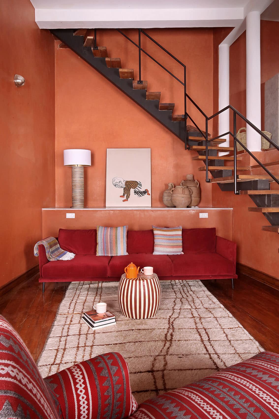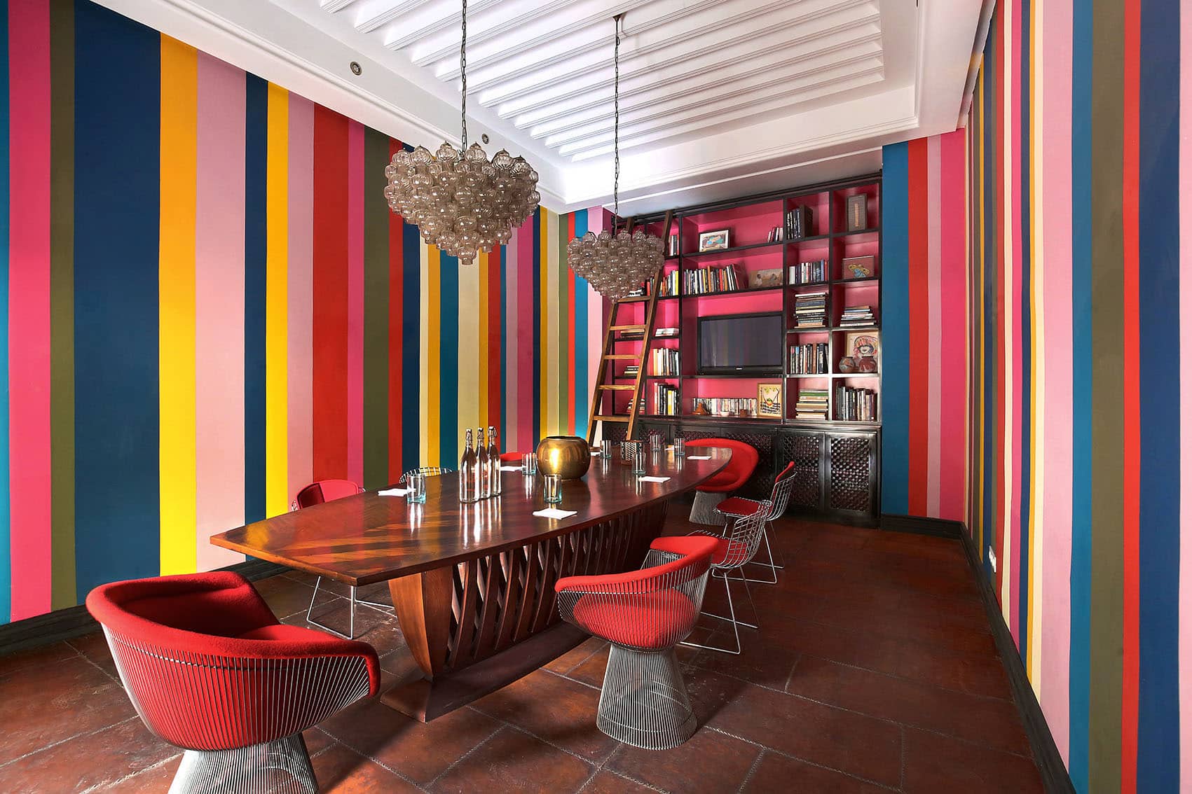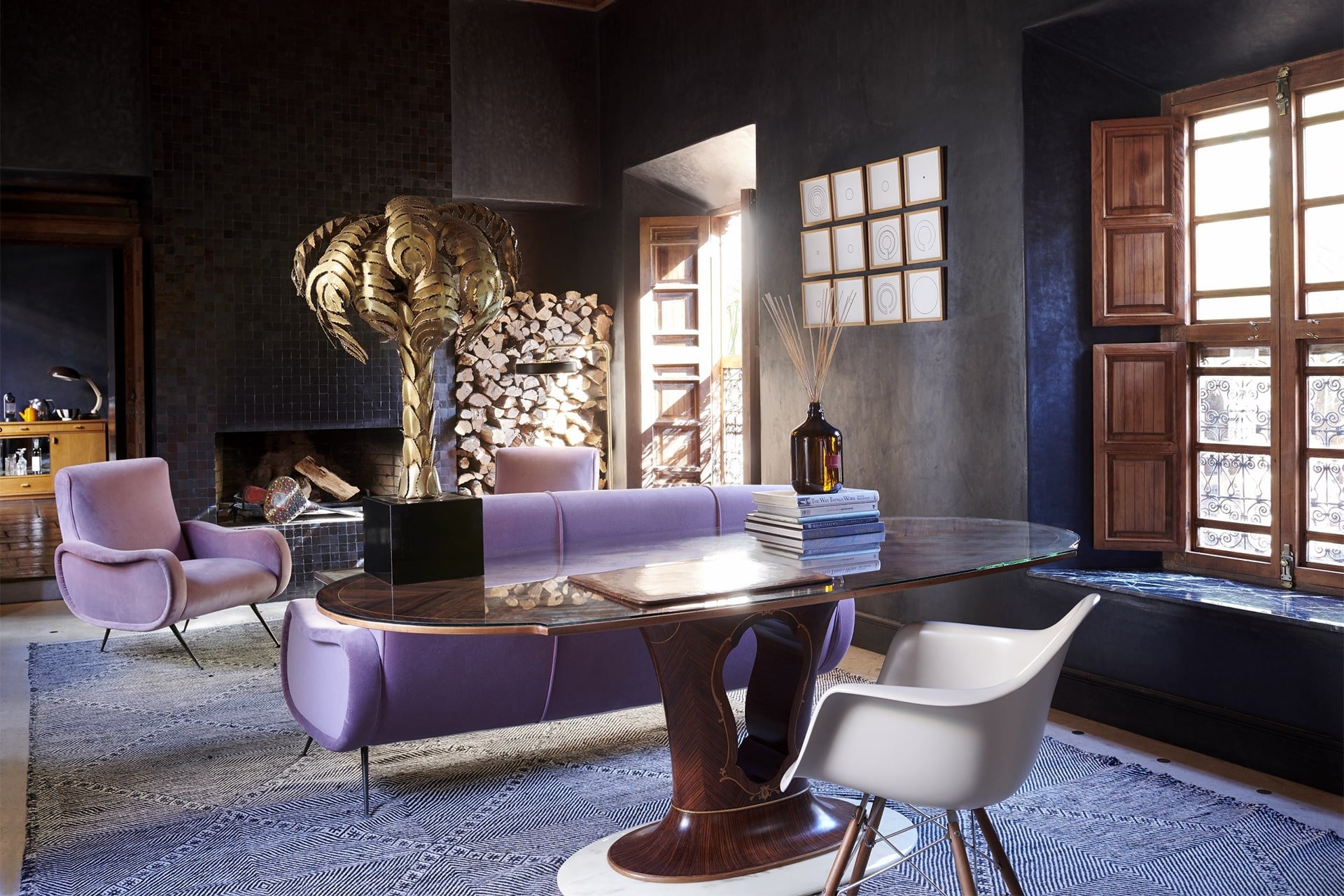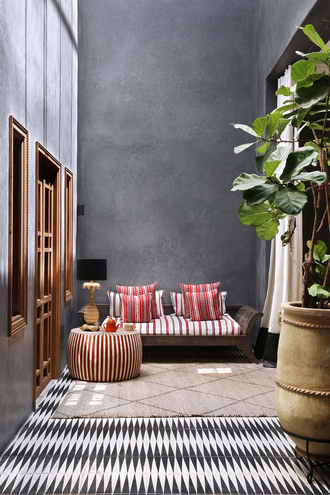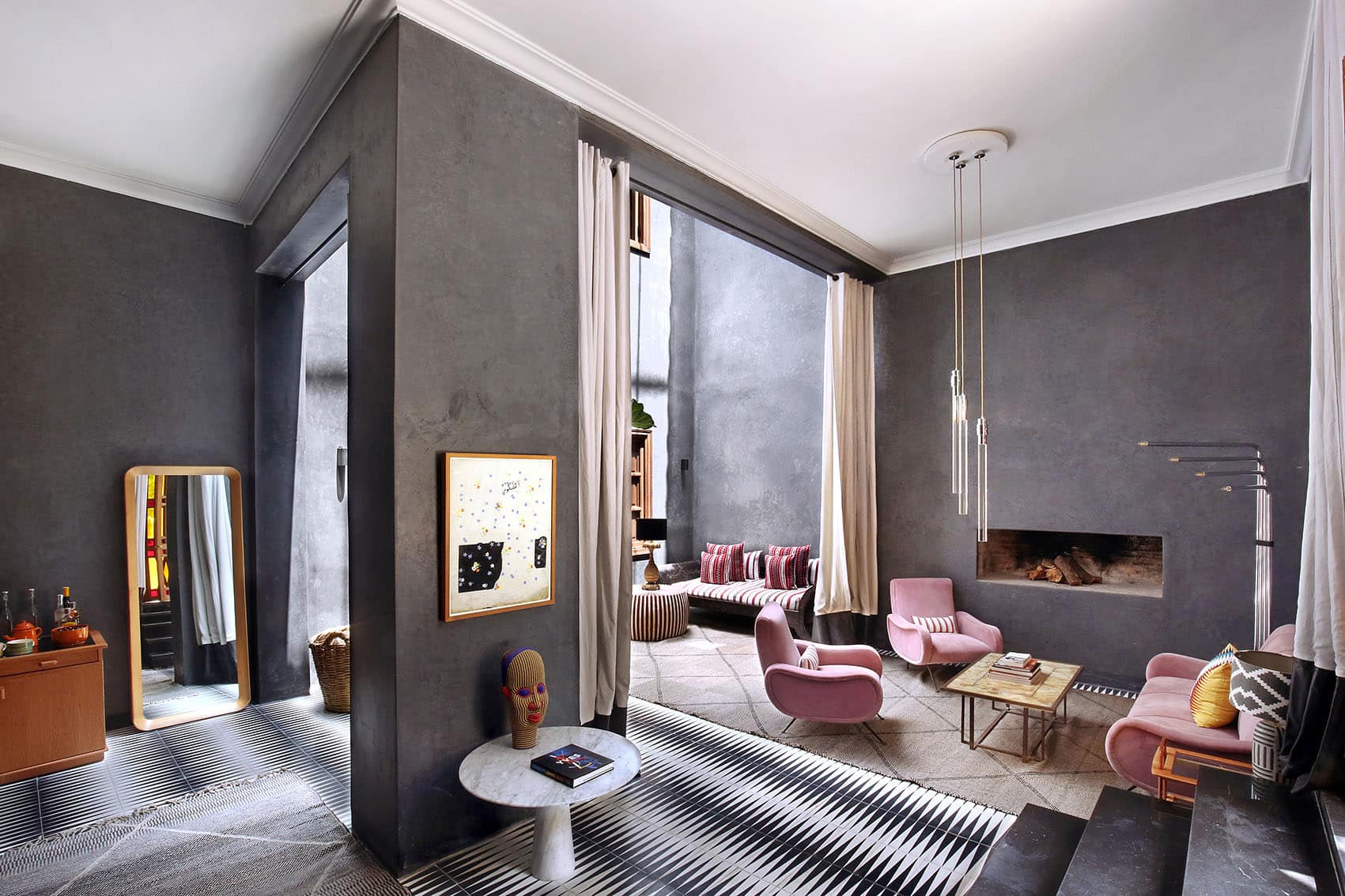 Здесь нет двух одинаковых комнат. Некоторые ярко-розовые, другие бирюзовые. В некоторых номерах полы из верблюжьей кожи ручной работы, а стены отделаны известковой штукатуркой. Но все они разделяют фирменный стиль: сочетание европейской мебели середины века с культовыми элементами марокканского дизайна, включая лепнину и потолки из кедрового дерева.
