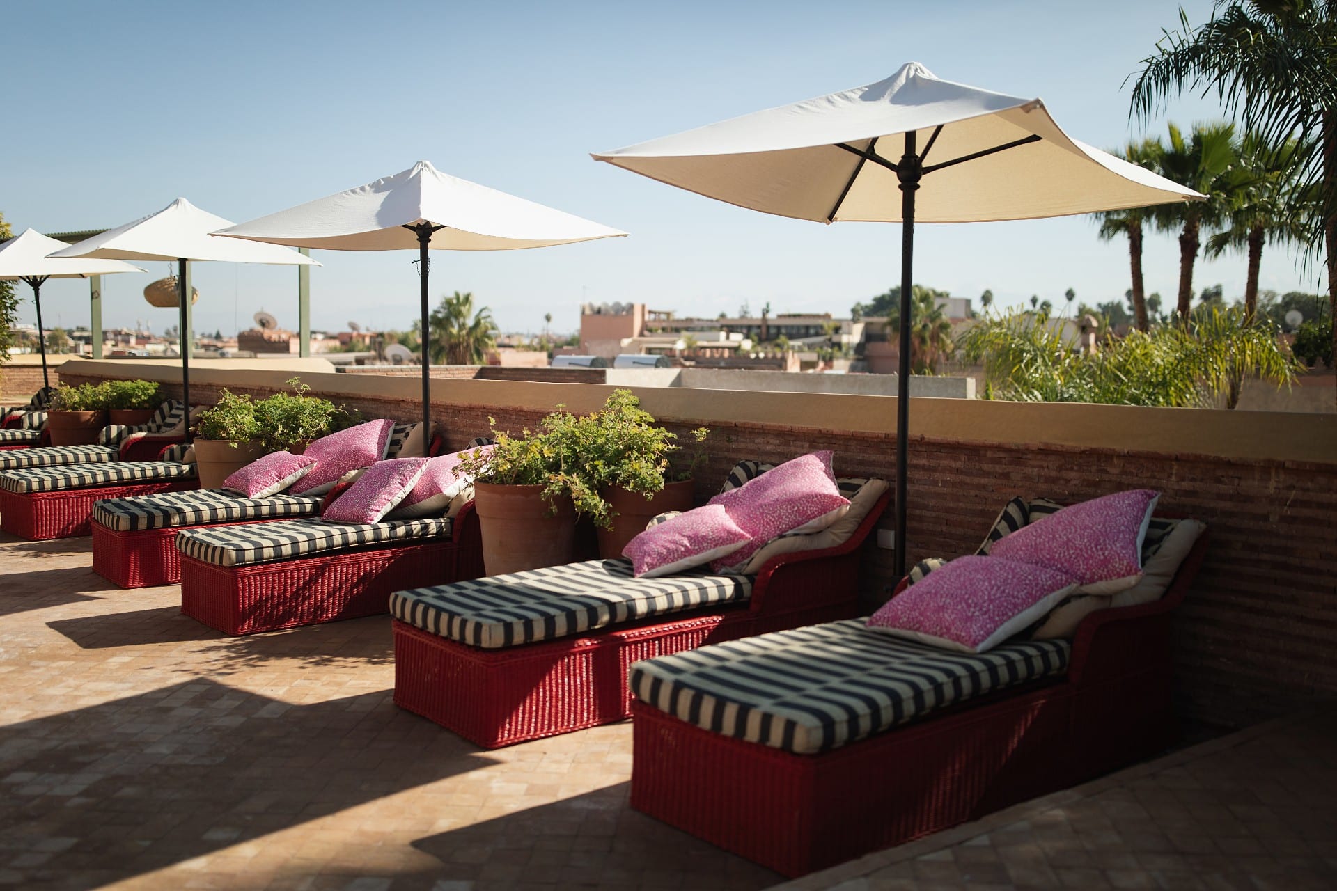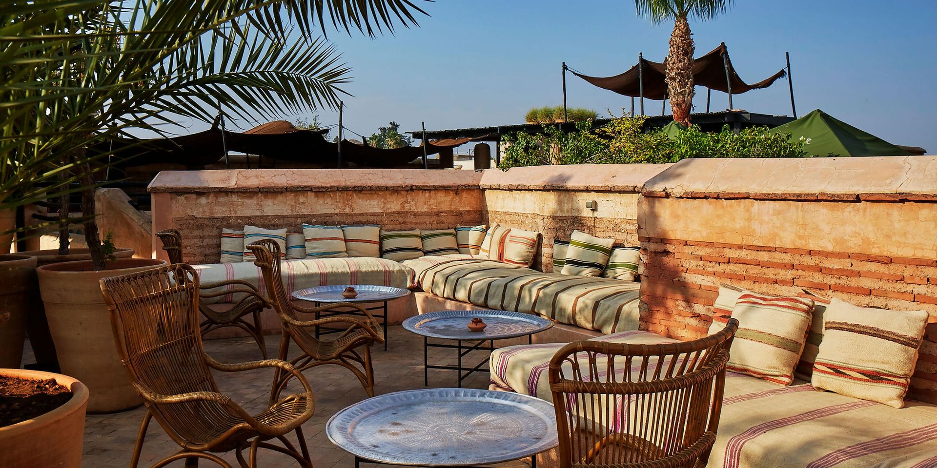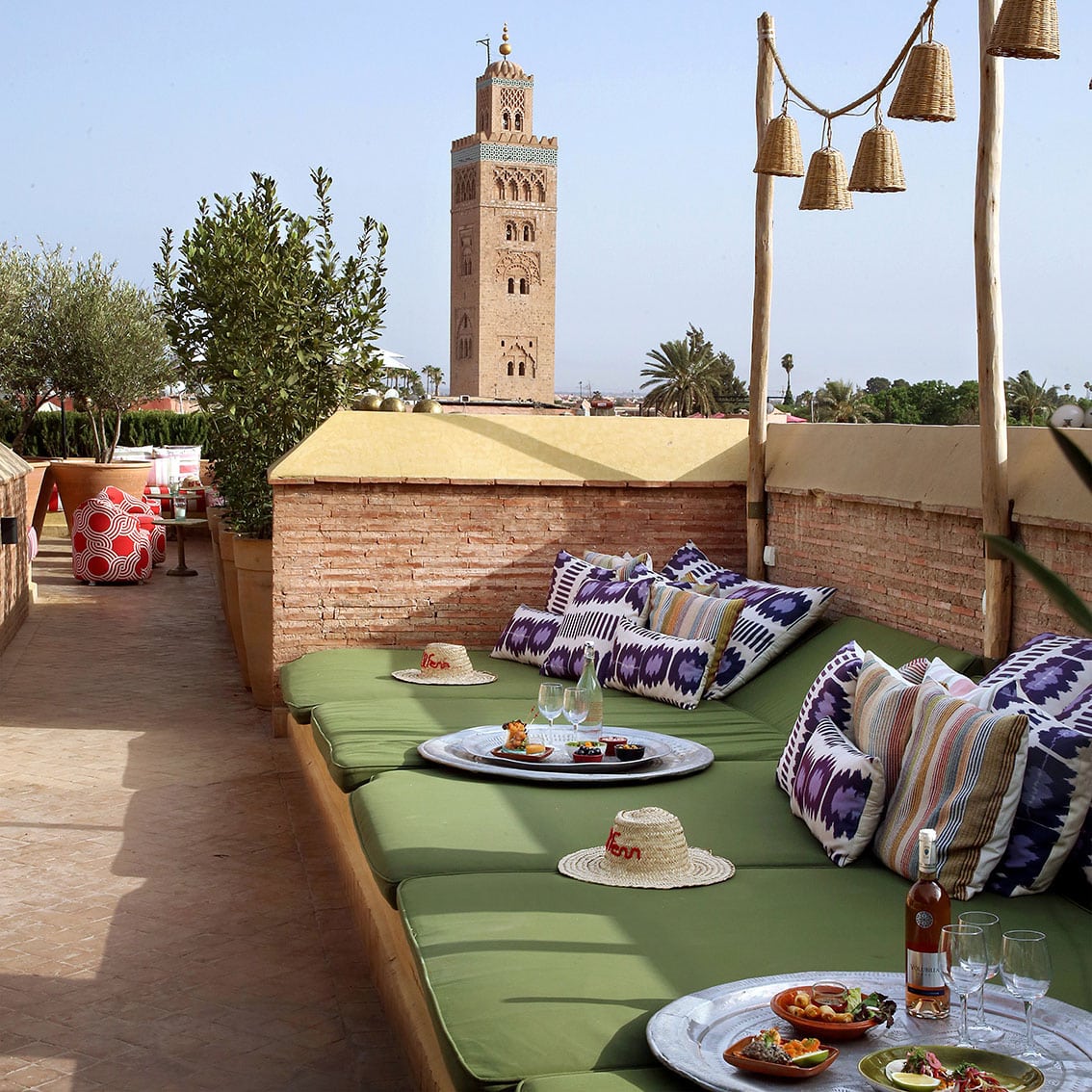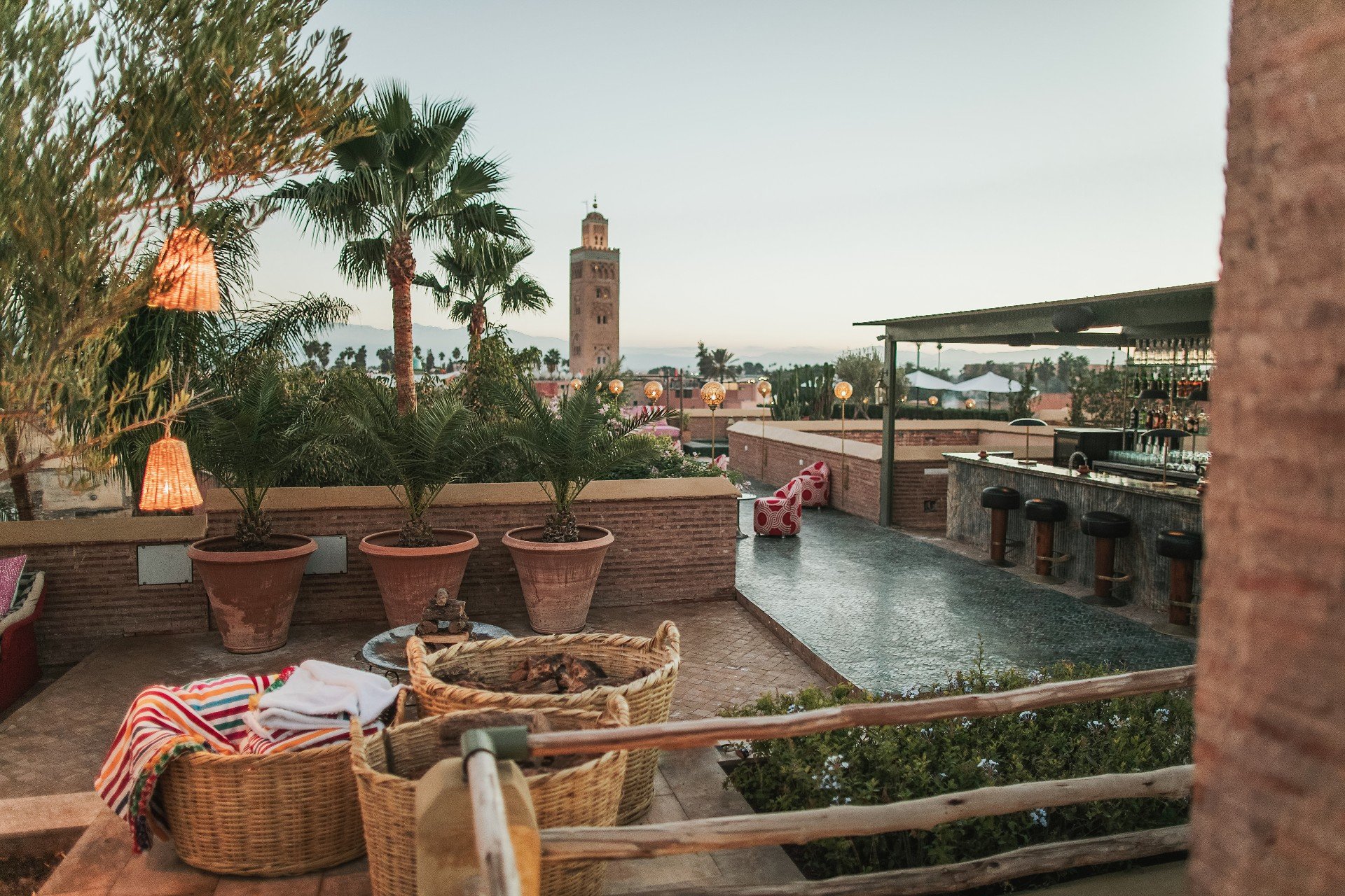 Терраса на крыше - самое популярное место отеля. Хотите ли вы отдохнуть на кушетке на солнышке или понаблюдать за закатом солнца над Атласскими горами, бар открыт каждый день для заказа свежих соков, коктейлей и еды, а после заката здесь достаточно шума, чтобы оживить ночи. Аромат жасмина наполняет воздух летом, в то время как зимой дым от открытых костров согревает холодными ночами.