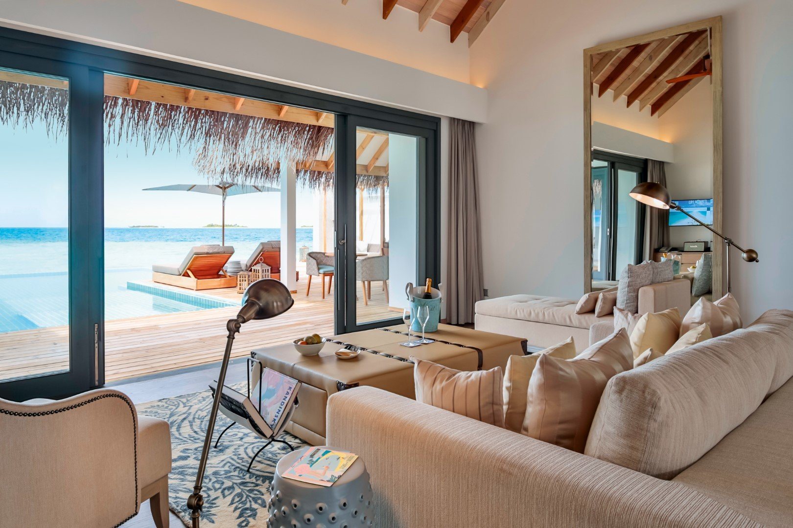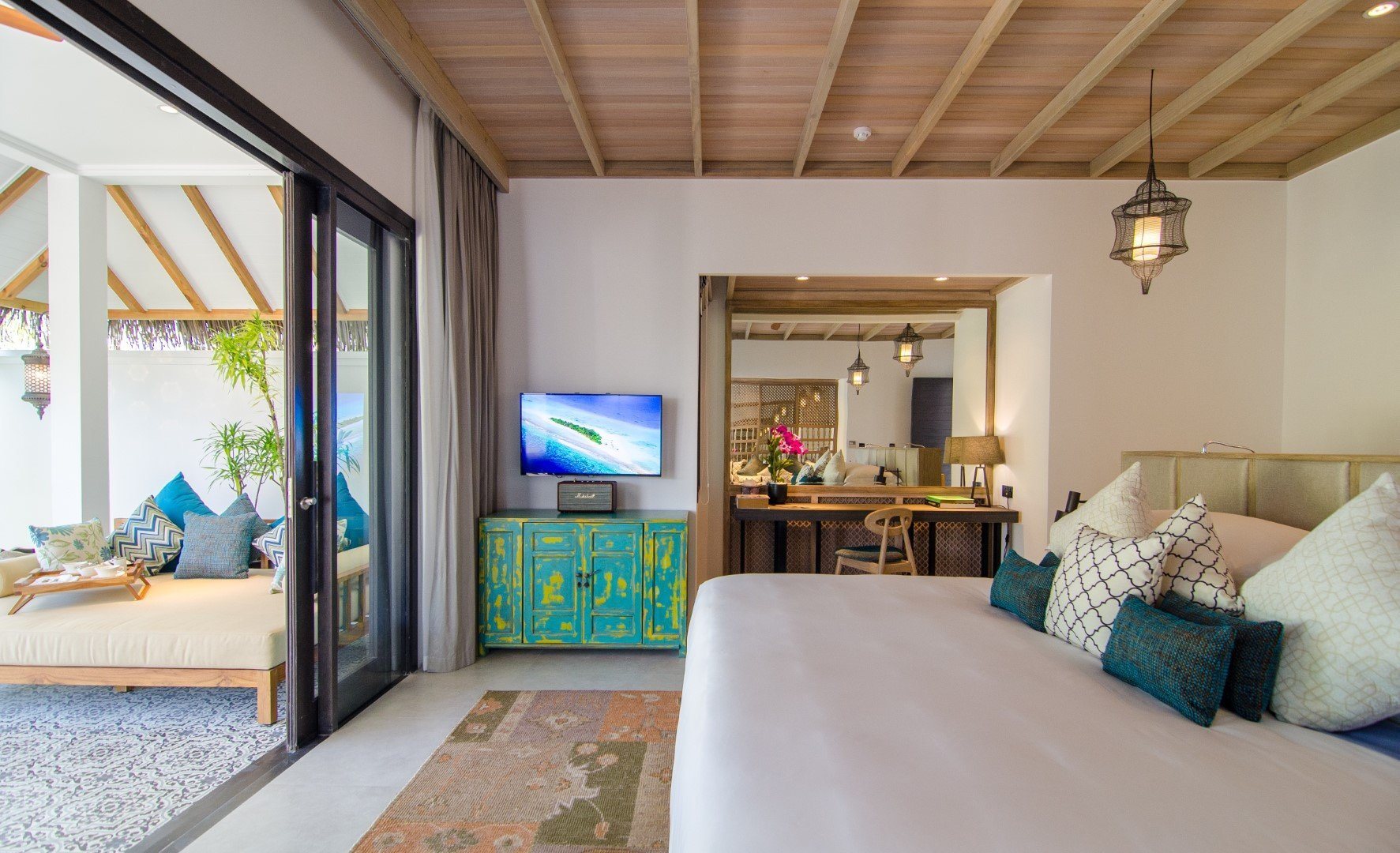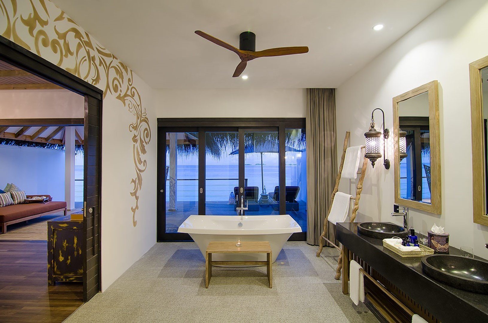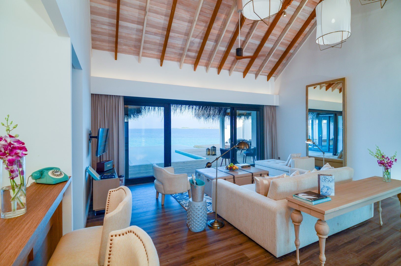 Дополнительное обаяние курорту придают тонкие шутки на тему ретро-люкса: например, на каждой вилле есть проигрыватель с коллекцией винила, а также винтажный телефон, по которому можно сделать только одно: заказать в номер шампанское.