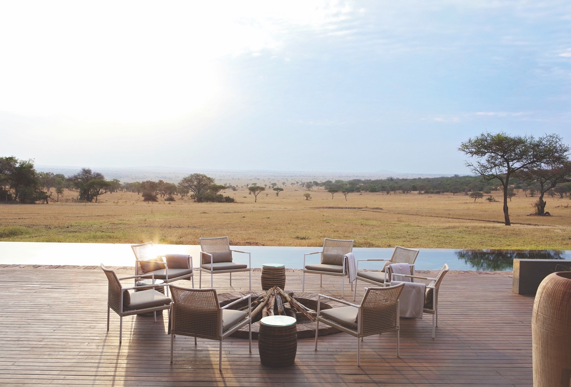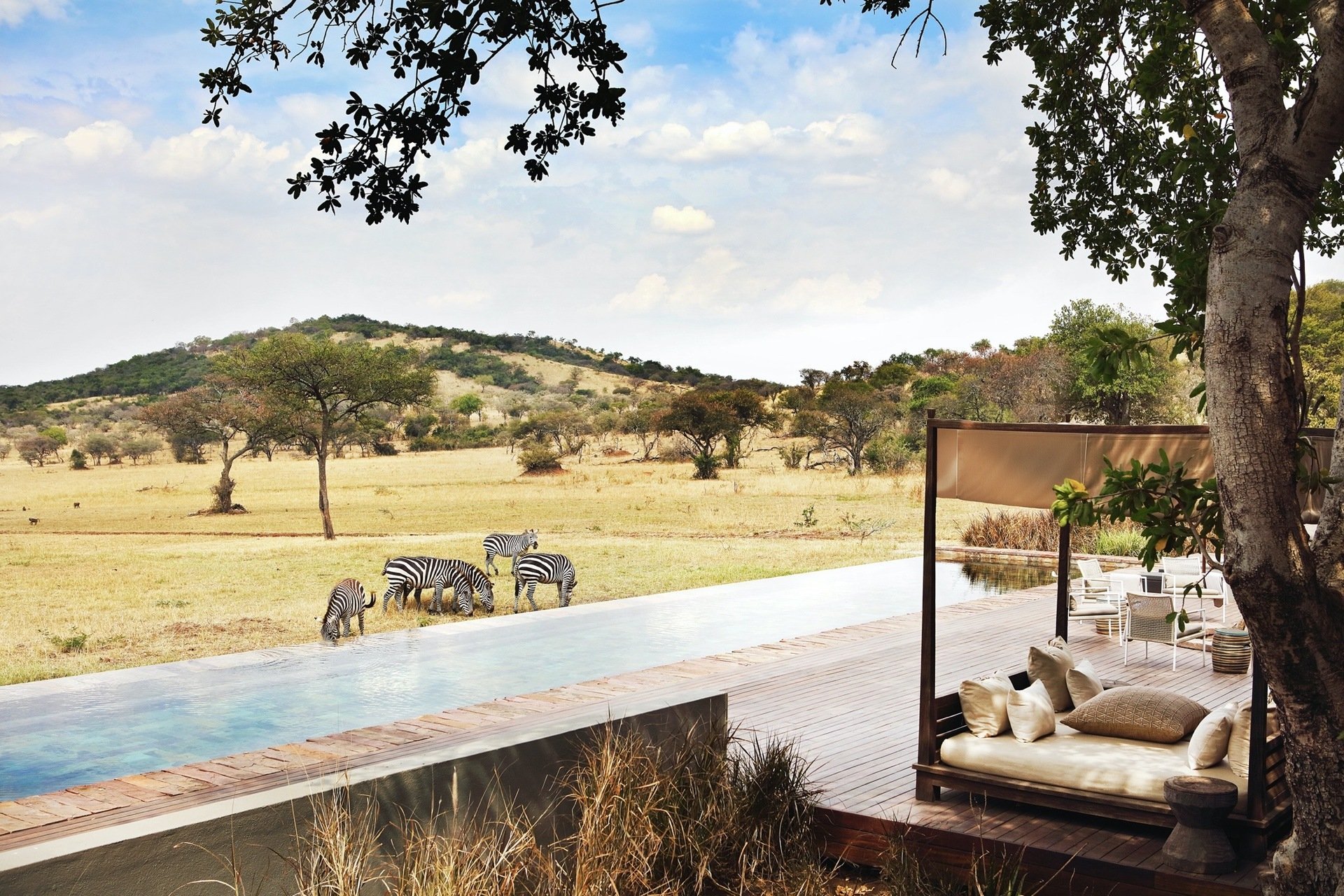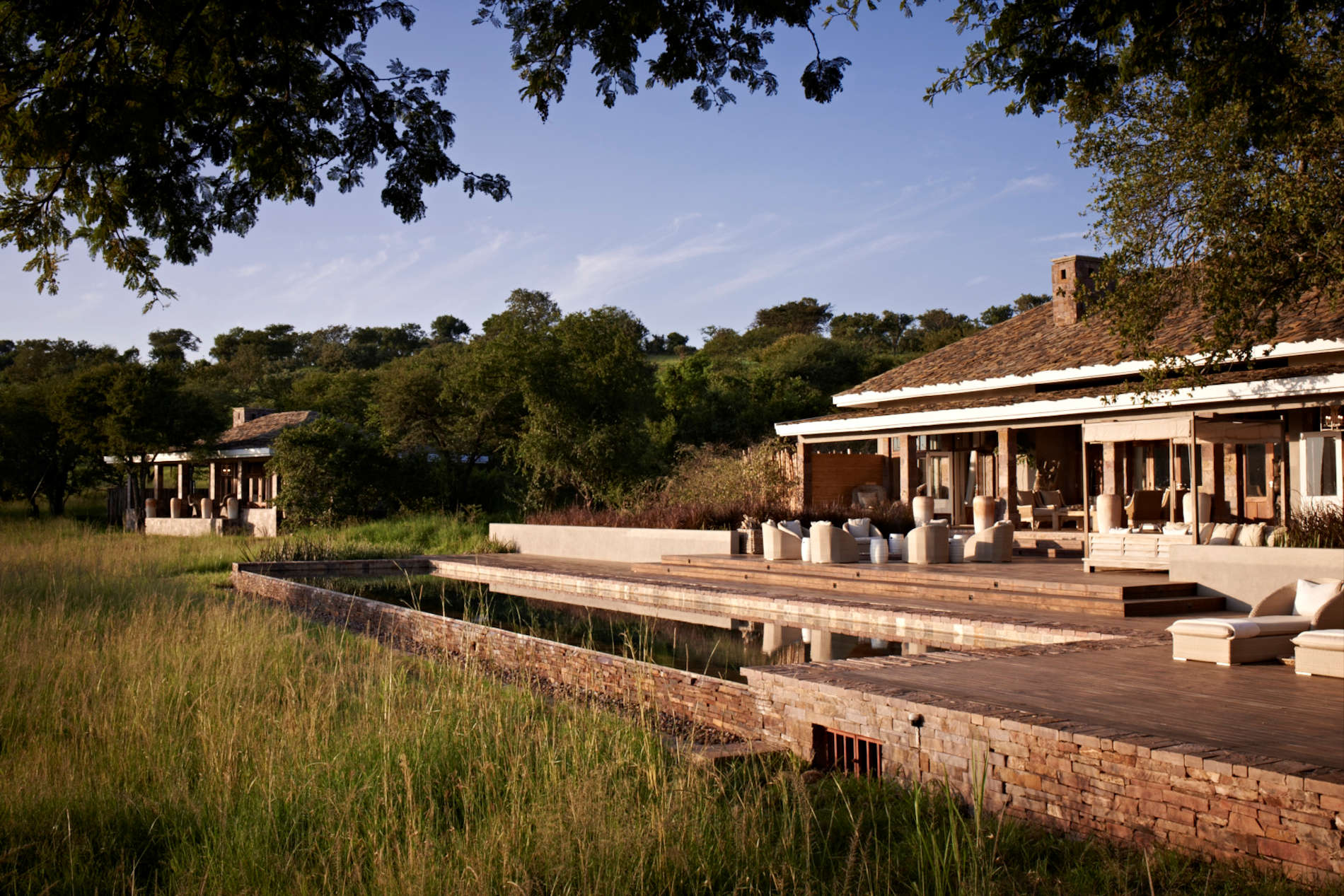 Под деревянной крышей сцена с кушетками и огромной ямой для костра спускается вниз, открывая кажущуюся бесконечной саванну, обрамленную пейзажным бассейном с видом на близлежащий водопой, куда приходят пить зебры и слоны. Сафари, верховая езда, пешие прогулки, теннис и спа-процедуры - это лишь некоторые из множества развлечений. Вы будете по-настоящему избалованы лучшими блюдами для гурманов во всем мире.