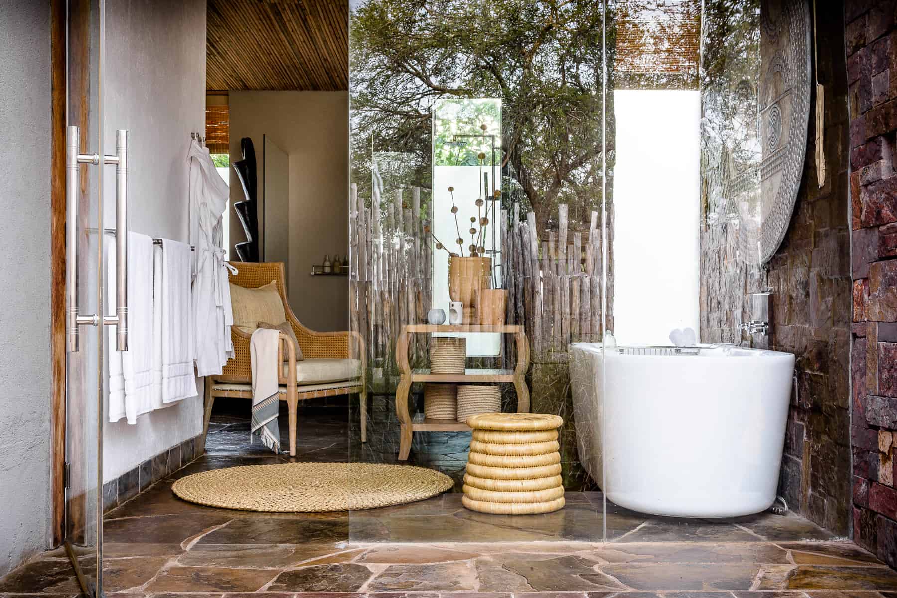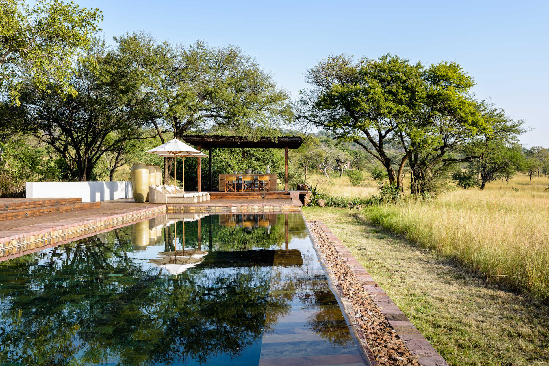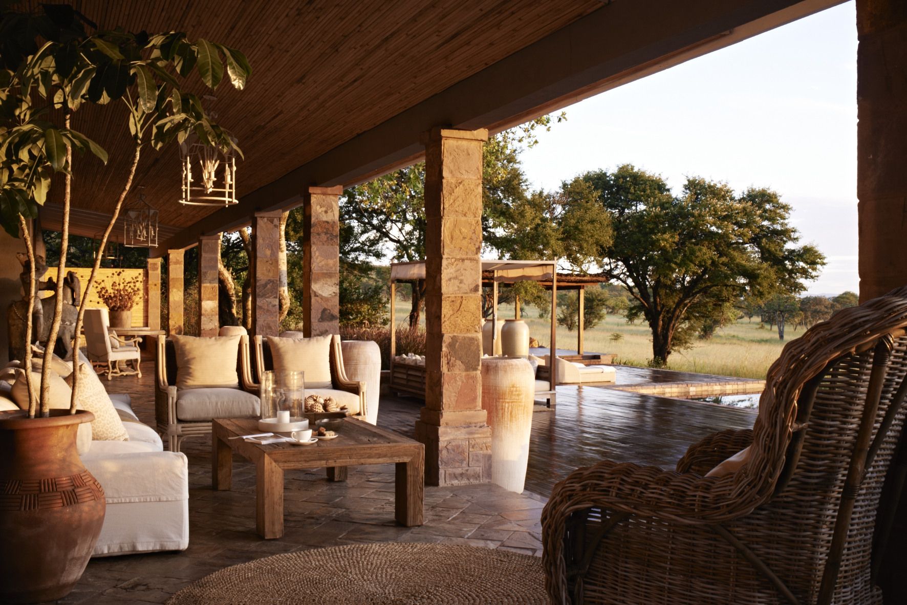 Под деревянной крышей сцена с кушетками и огромной ямой для костра спускается вниз, открывая кажущуюся бесконечной саванну, обрамленную пейзажным бассейном с видом на близлежащий водопой, куда приходят пить зебры и слоны. Сафари, верховая езда, пешие прогулки, теннис и спа-процедуры - это лишь некоторые из множества развлечений. Вы будете по-настоящему избалованы лучшими блюдами для гурманов во всем мире.